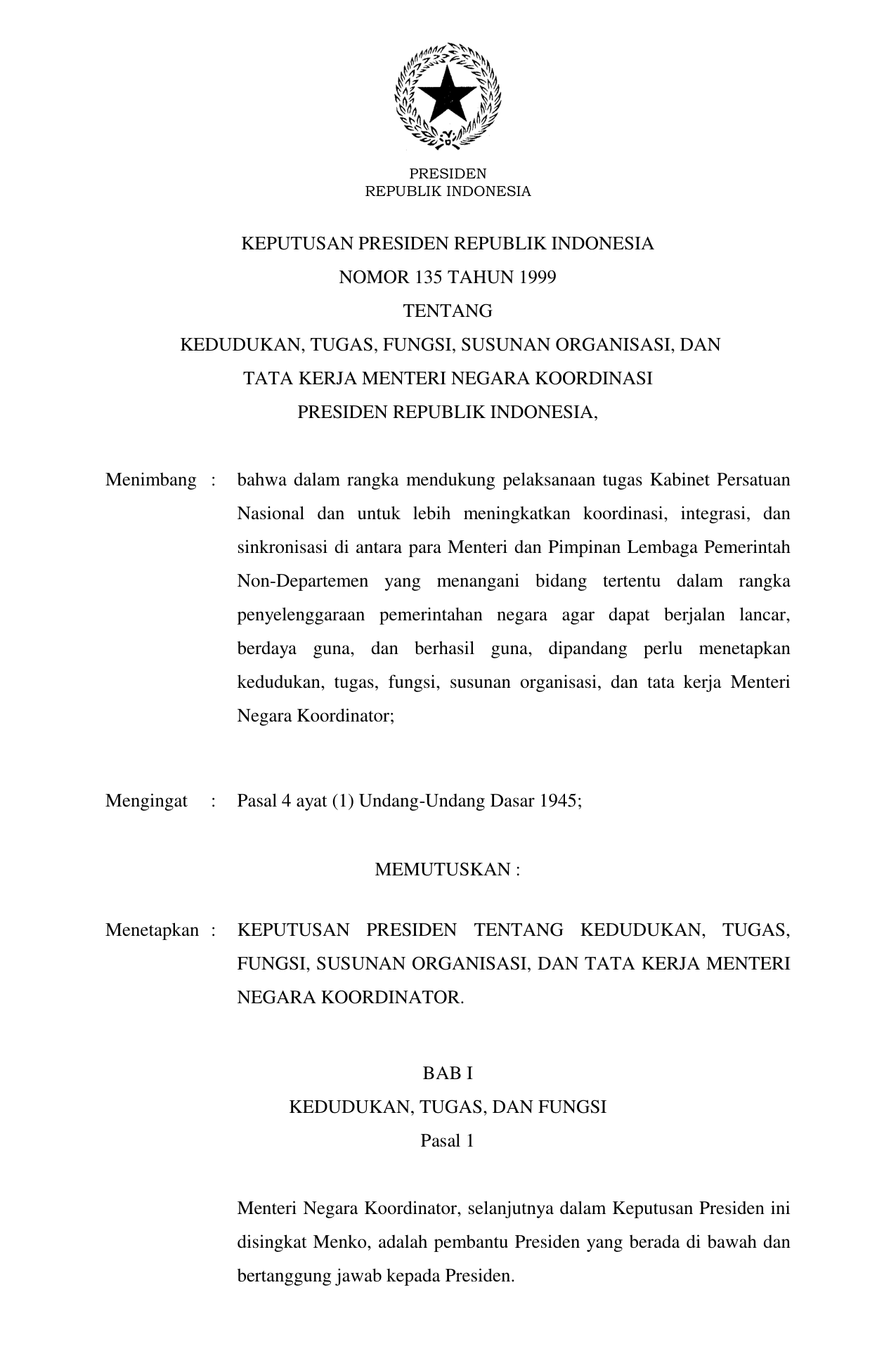 KEPPRES Nomor 135 Tahun 1999 | Keputusan Presiden Nomor 135 Tahun 1999 tentang KEDUDUKAN, TUGAS, FUNGSI, SUSUNAN ORGANISASI, DAN TATA KERJA MENTERI NEGARA KOORDINATOR