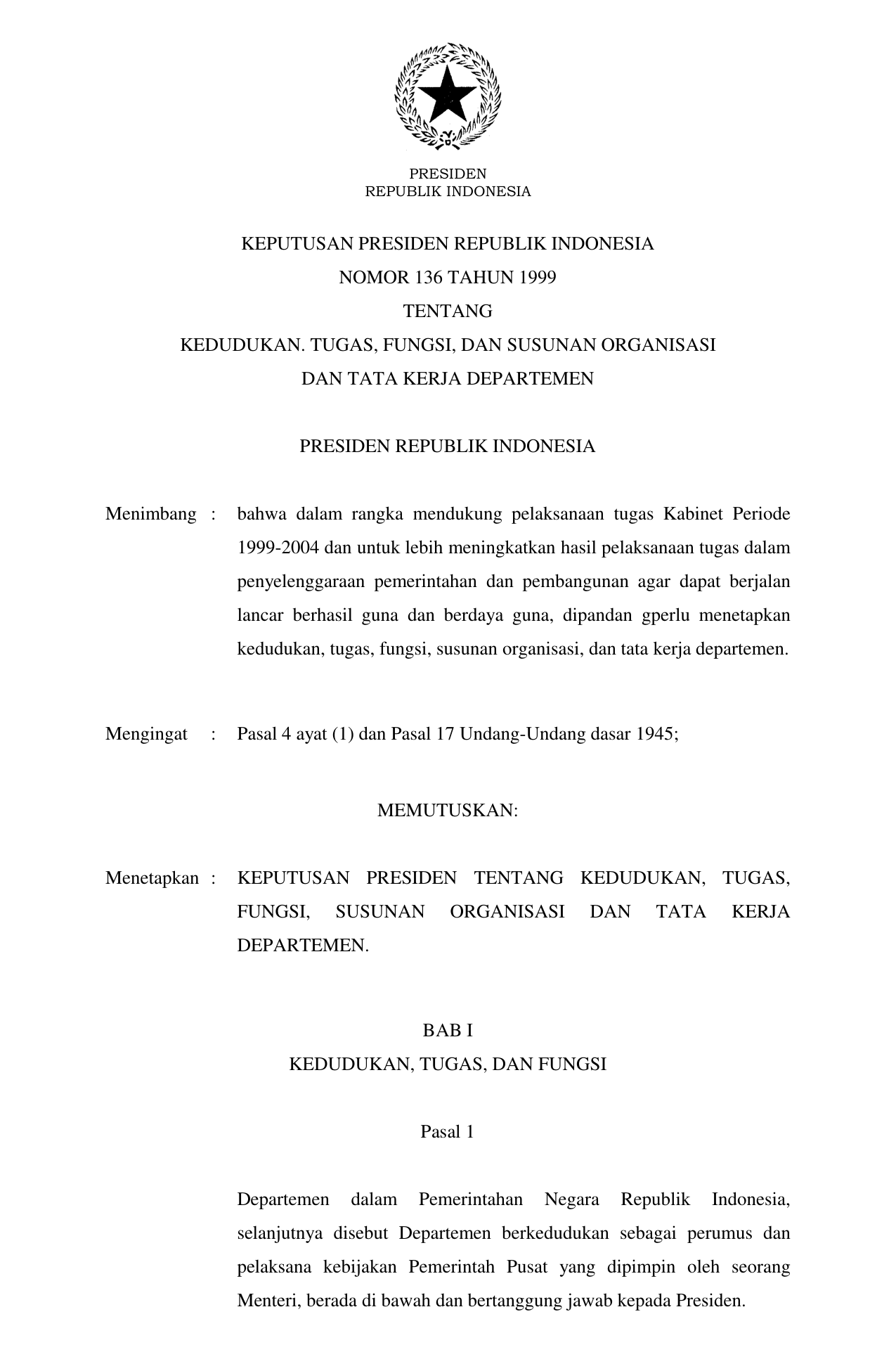 KEPPRES Nomor 136 Tahun 1999 | Keputusan Presiden Nomor 136 Tahun 1999 tentang KEDUDUKAN, TUGAS, FUNGSI, SUSUNAN ORGANISASI, DAN TATA KERJA DEPARTEMEN