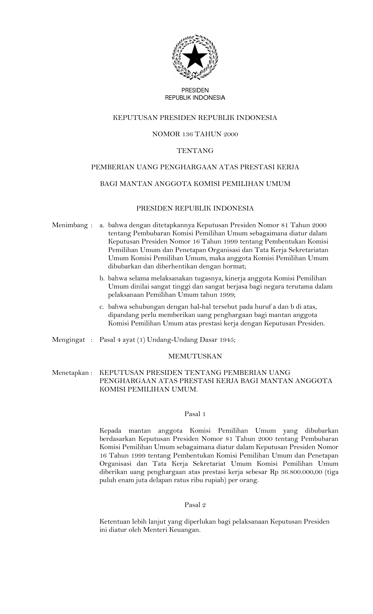 KEPPRES Nomor 136 Tahun 2000 | Keputusan Presiden Nomor 136 Tahun 2000 tentang PEMBERIAN UANG PENGHARGAAN ATAS PRESTASI KERJABAGI MANTAN ANGGOTA KOMISI PEMILIHAN UMUM