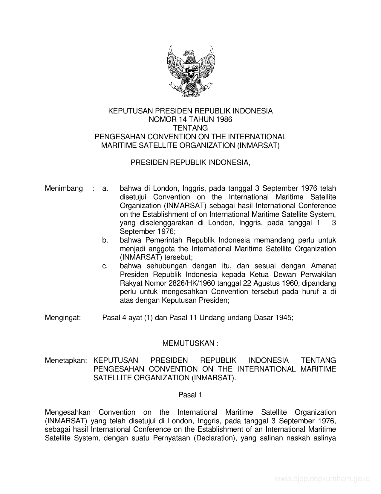 KEPPRES Nomor 14 Tahun 1986 | Keputusan Presiden Nomor 14 Tahun 1986 tentang PENGESAHAN CONVENTION ON THE INTERNATIONAL MARITIME SATELLITE ORGANIZATION (INMARSAT)