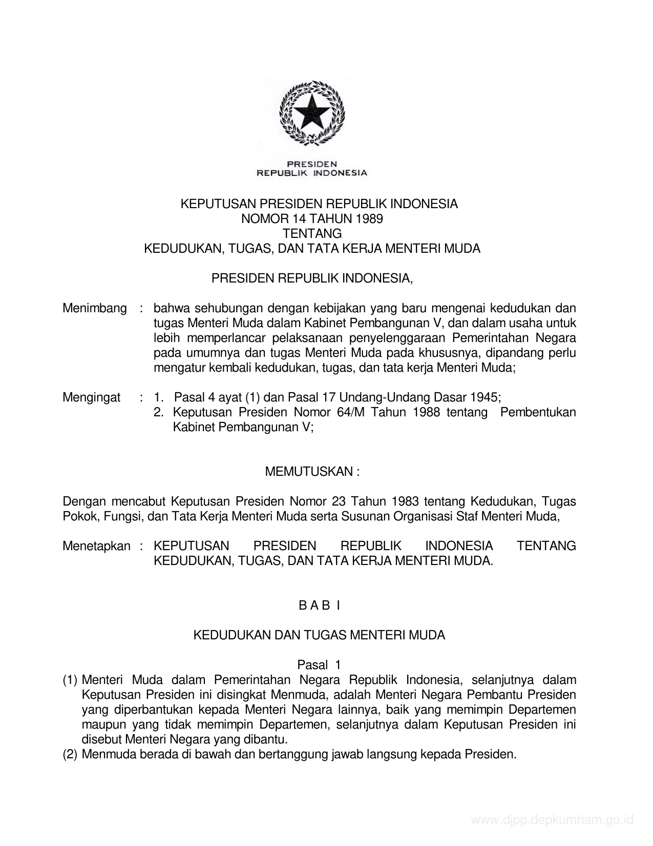 KEPPRES Nomor 14 Tahun 1989 | Keputusan Presiden Nomor 14 Tahun 1989 tentang KEDUDUKAN, TUGAS, DAN TATA KERJA MENTERI MUDA