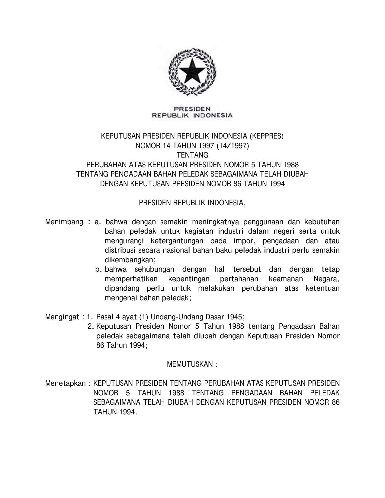 KEPPRES Nomor 14 Tahun 1997 | Keputusan Presiden Nomor 14 Tahun 1997 tentang PERUBAHAN KEPPRES 5-1988 TENTANG PENGADAAN BAHAN PELEDAK SEBAGAIMANA TELAH DIUBAH DENGAN KEPPRES 86-1994