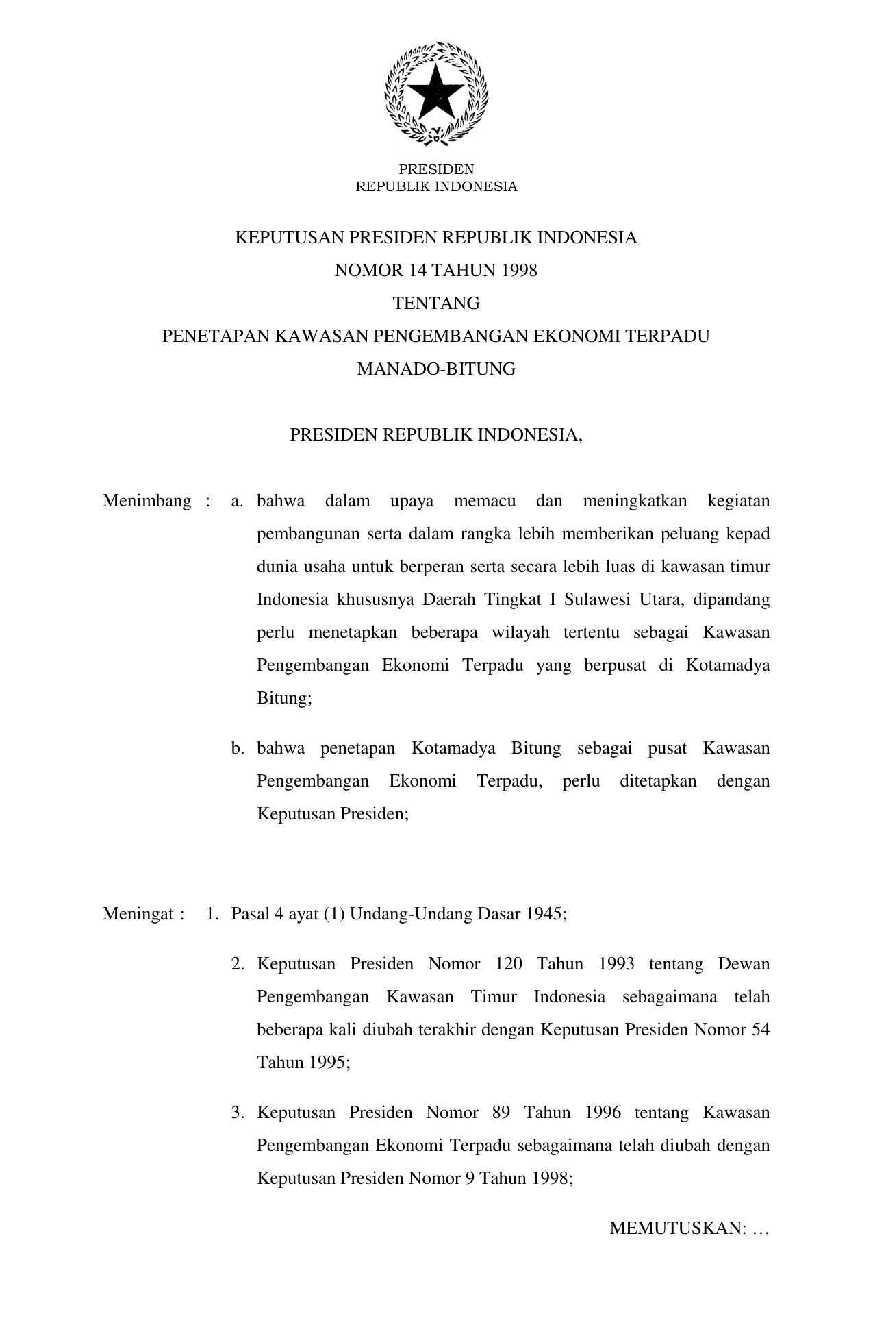 KEPPRES Nomor 14 Tahun 1998 | Keputusan Presiden Nomor 14 Tahun 1998 tentang PENETAPAN KAWASAN PENGEMBANGAN EKONOMI TERPADU BITUNG