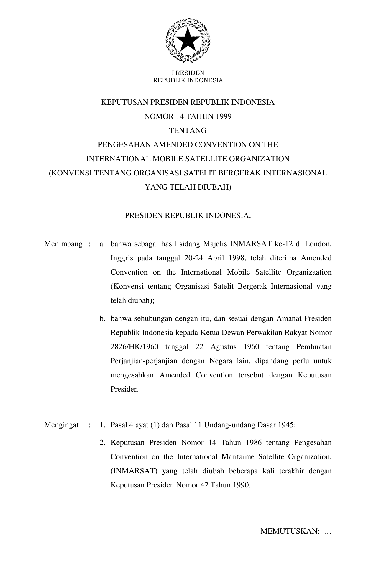KEPPRES Nomor 14 Tahun 1999 | Keputusan Presiden Nomor 14 Tahun 1999 tentang PENGESAHAN AMENDED CONVENTION ON THE INTERNATIONAL MOBILE SATELLITE ORGANIZATION (KONVENSI TENTANG ORGANISASI SATELIT BERGERAK INTERNASIONAL YANG TELAH DIUBAH