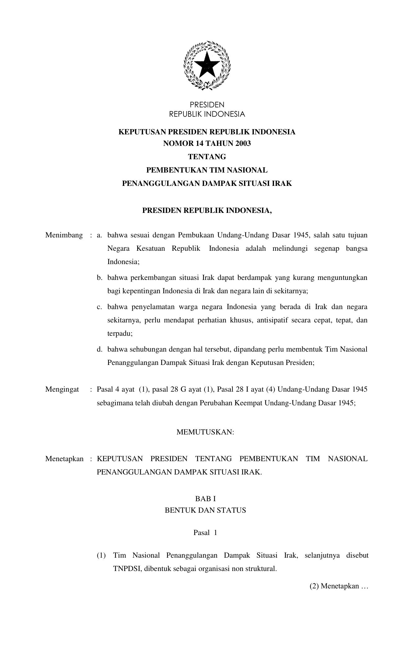 KEPPRES Nomor 14 Tahun 2003 | Keputusan Presiden Nomor 14 Tahun 2003 tentang PEMBENTUKAN TIM NASIONAL PENANGGULANGAN DAMPAK SITUASI IRAK