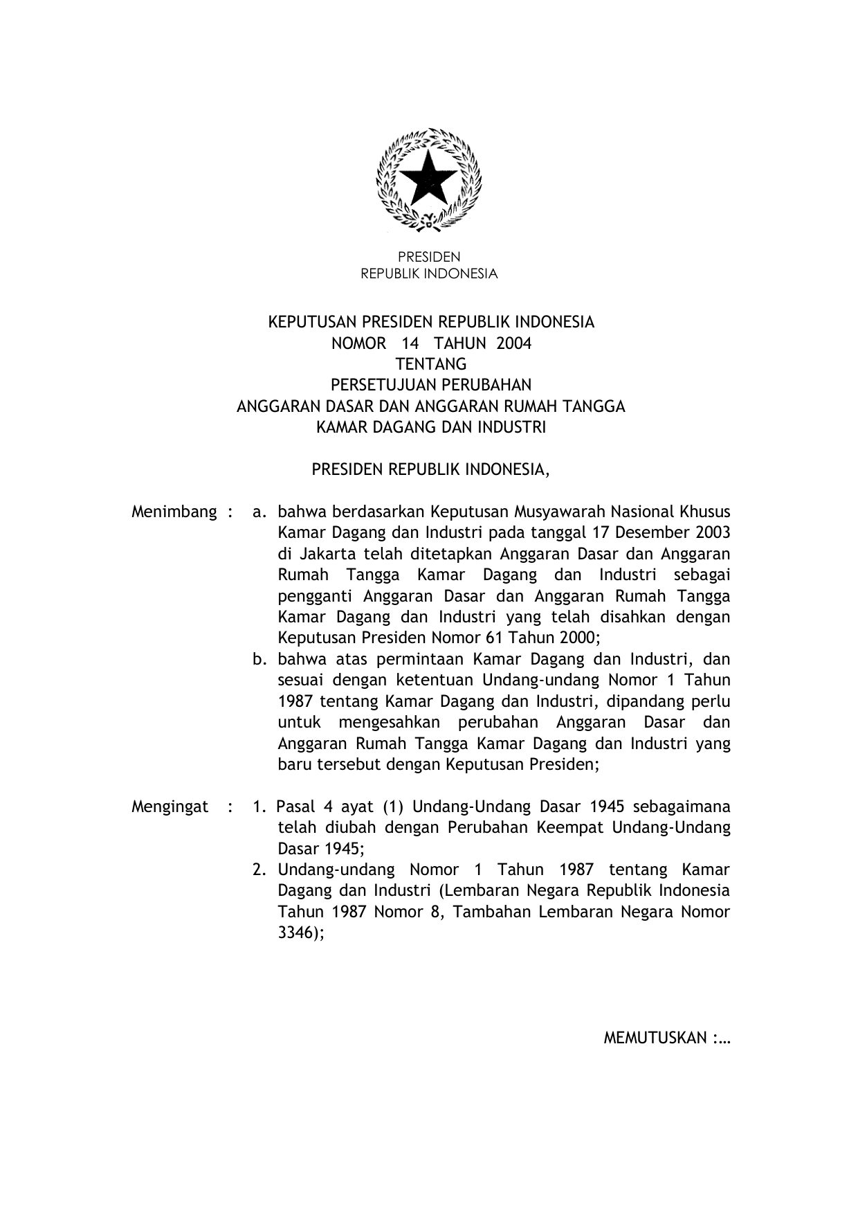 KEPPRES Nomor 14 Tahun 2004 | Keputusan Presiden Nomor 14 Tahun 2004 tentang PERSETUJUAN PERUBAHAN ANGGARAN DASAR DAN ANGGARAN RUMAH TANGGA KAMAR DAGANG DAN INDUSTRI