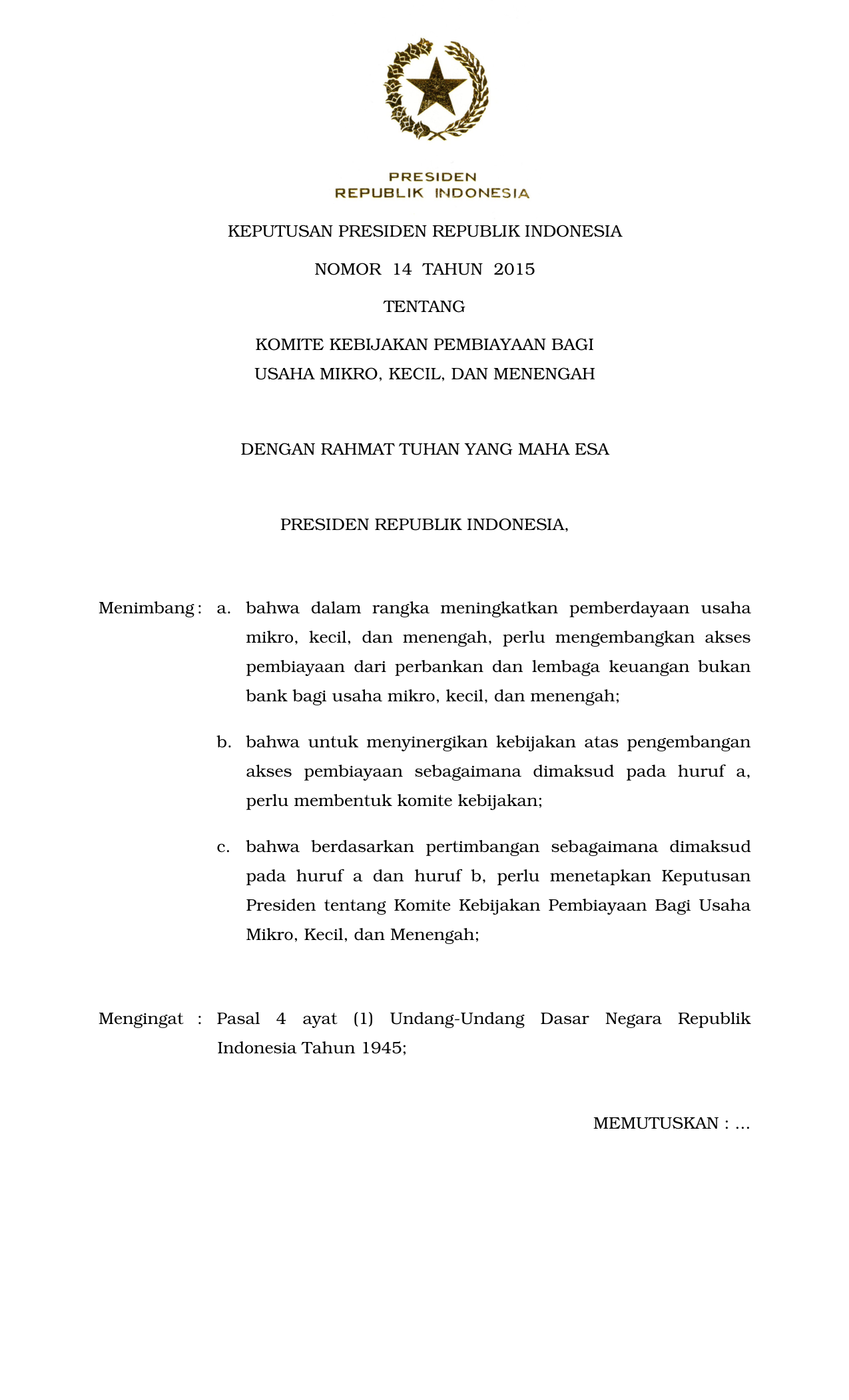 KEPPRES Nomor 14 Tahun 2015 | Keputusan Presiden Nomor 14 Tahun 2015 tentang KOMITE KEBIJAKAN PEMBIAYAAN BAGI USAHA MIKRO, KECIL, DAN MENENGAH