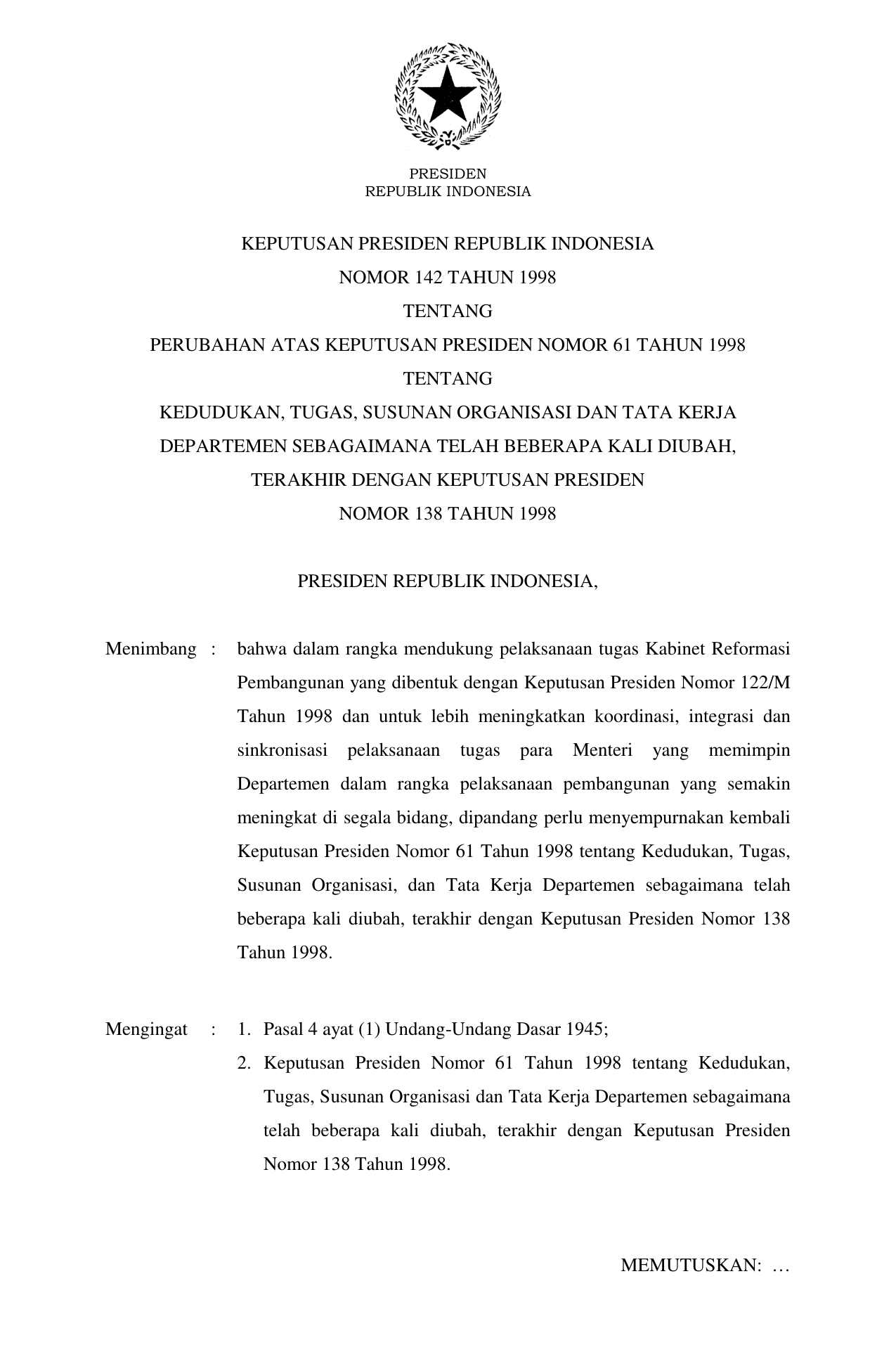 KEPPRES Nomor 142 Tahun 1998 | Keputusan Presiden Nomor 142 Tahun 1998 tentang PERUBAHAN ATAS KEPUTUSAN PRESIDEN NOMOR 61 TAHUN 1998 TENTANG KEDUDUKAN, TUGAS, SUSUNAN ORGANISASI DAN TATA KERJA DEPARTEMEN SEBAGAIMANA TELAH BEBERAPA KALI DIUBAH, TERAKHIR DENGAN KEPUTUSAN PRESIDEN NOMOR 138 TAHUN 1998