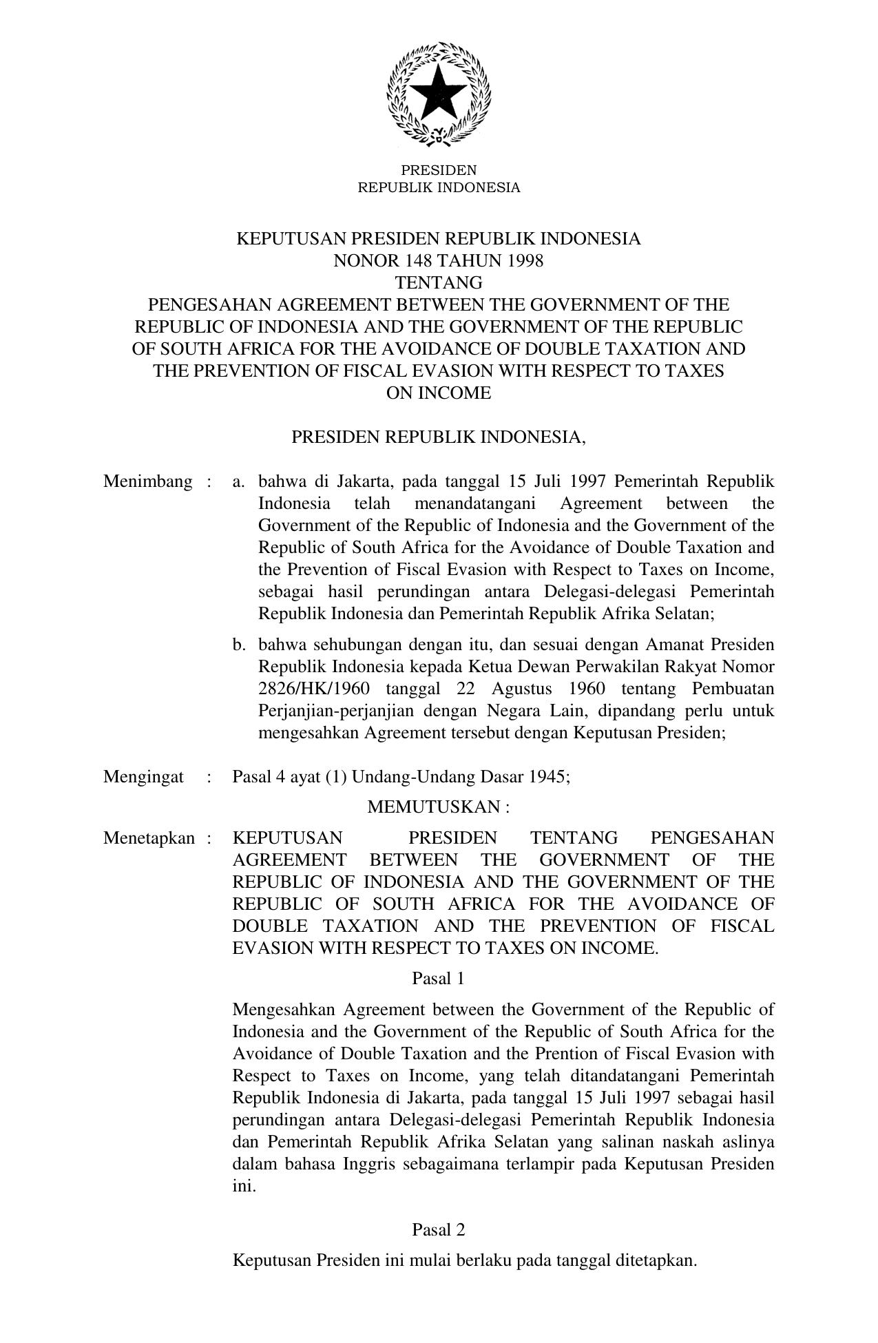 KEPPRES Nomor 148 Tahun 1998 | Keputusan Presiden Nomor 148 Tahun 1998 tentang PENGESAHAN AGREEMENT BETWEEN THE GOVERNMENT OF THE REPUBLIC OF INDONESIA AND THE GOVERNMENT OF THE REPUBLIC OF SOUTH AFRICA FOR THE AVOIDANCE OF DOUBLE TAXATION AND THE PREVENTION OF FISCAL EVASION WITH RESPECT TO TAXES ON INCOME