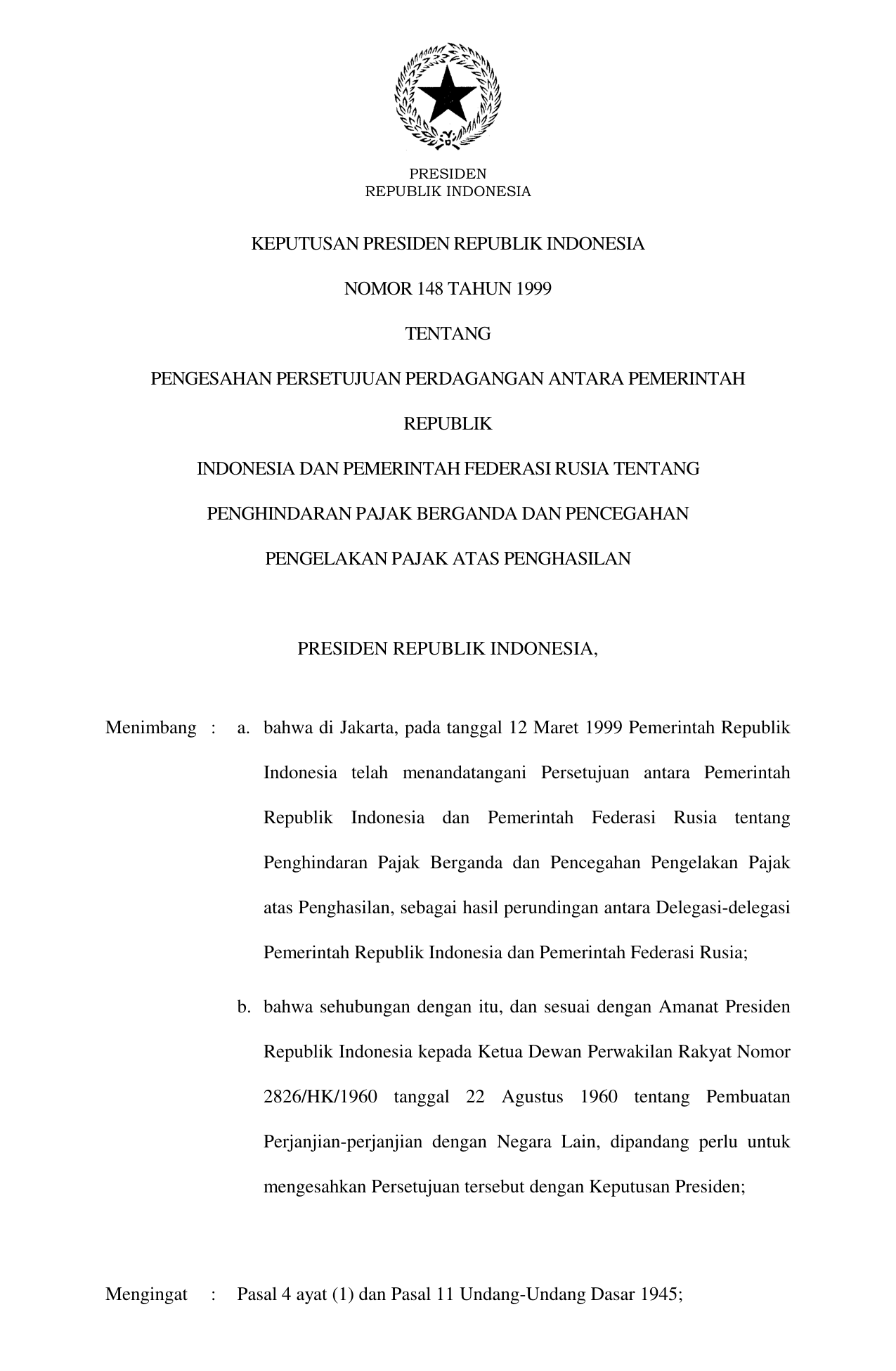 KEPPRES Nomor 148 Tahun 1999 | Keputusan Presiden Nomor 148 Tahun 1999 tentang PENGESAHAN PERSETUJUAN ANTARA PEMERINTAH RI DAN PEMERINTAH FEDERASI RUSIA TENTANG PENGHINDARAN PAJAK BERGANDA DAN PENCEGAHAN PENEGLAKAN PAJAK DAN PENGHASILAN