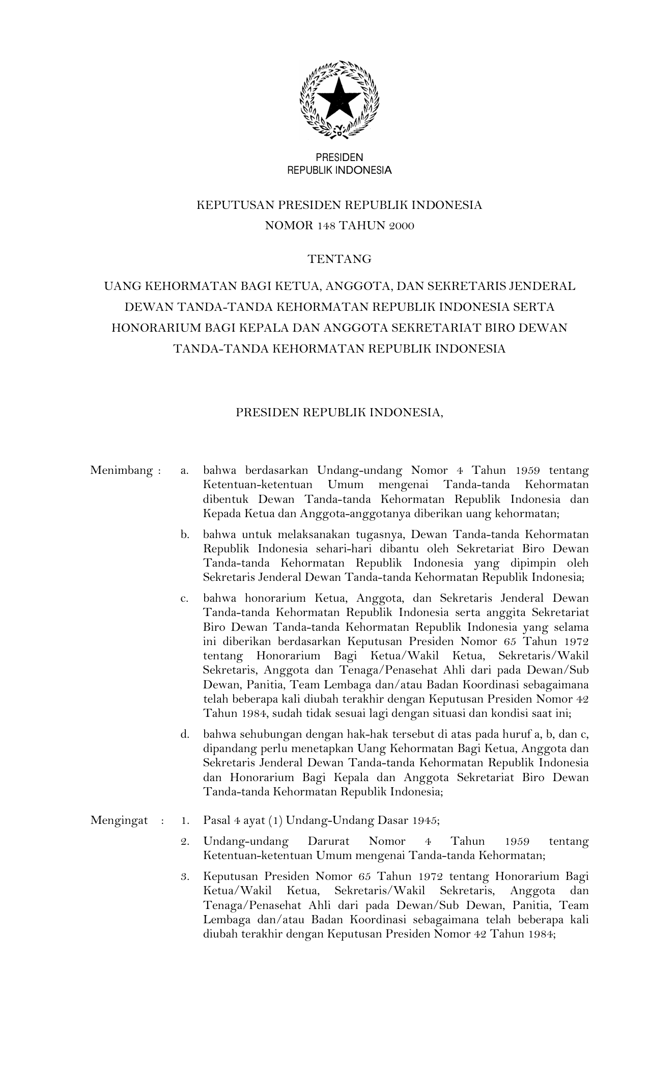 KEPPRES Nomor 148 Tahun 2000 | Keputusan Presiden Nomor 148 Tahun 2000 tentang UANG KEHORMATAN BAGI KETUA, ANGGOTA, DAN SEKRETARIS JENDERAL DEWAN TANDA-TANDA KEHORMATAN REPUBLIK INDONESIA SERTA HONORARIUM BAGI KEPALA DAN ANGGOTA SEKRETARIAT BIRO DEWAN TANDA-TANDA KEHORMATAN REPUBLIK INDONESIA