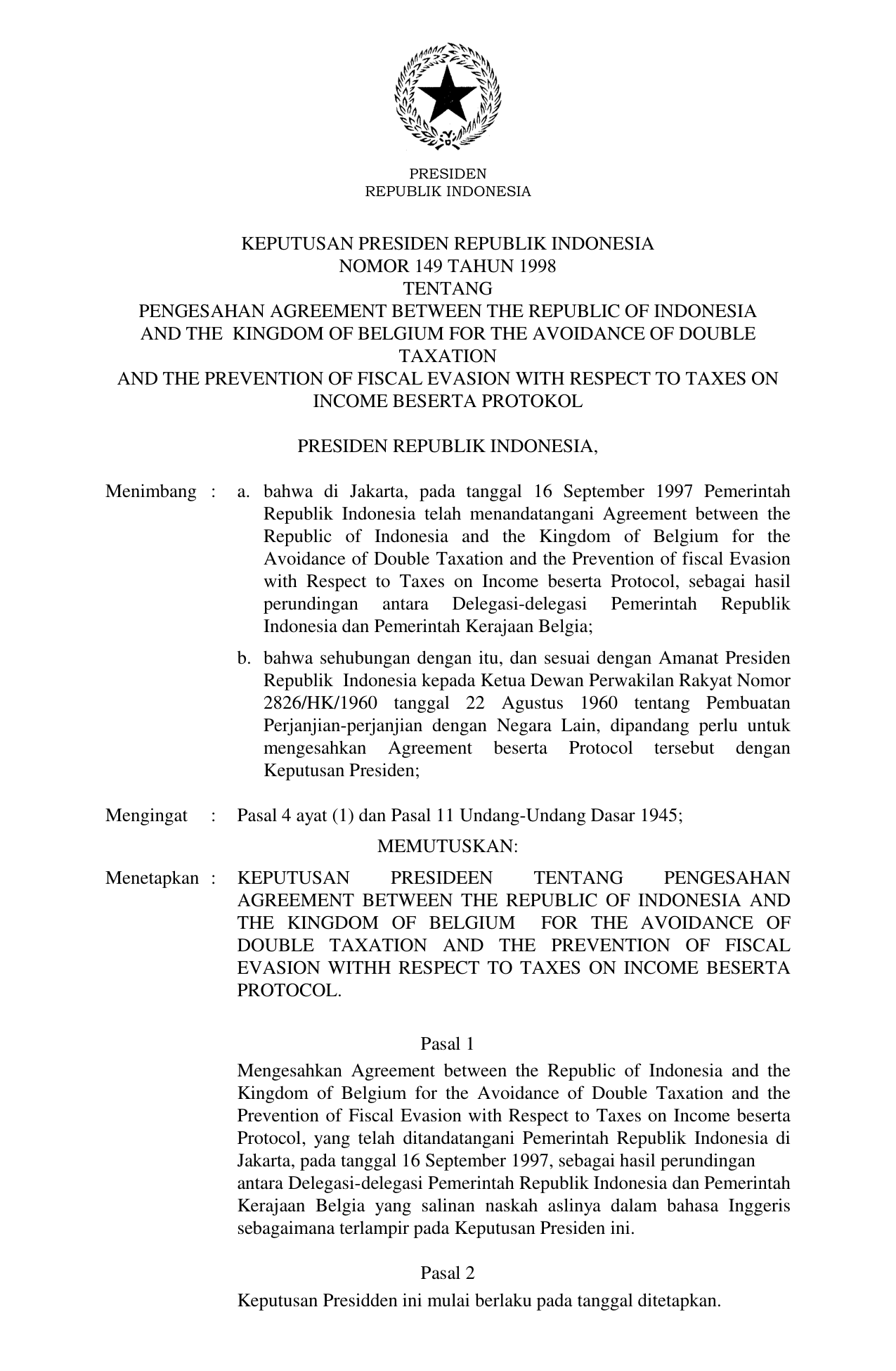 KEPPRES Nomor 149 Tahun 1998 | Keputusan Presiden Nomor 149 Tahun 1998 tentang PENGESAHAN AGREEMENT BETWEEN THE REPUBLIC OF INDONESIA AND THE KINGDOM OF BELGIUM FOR THE AVOIDANCE OF DOUBLE TAXATION AND THE PREVENTION OF FISCAL EVASION WITH RESPECT TO TAXES ON INCOME BESERTA PROTOKOL