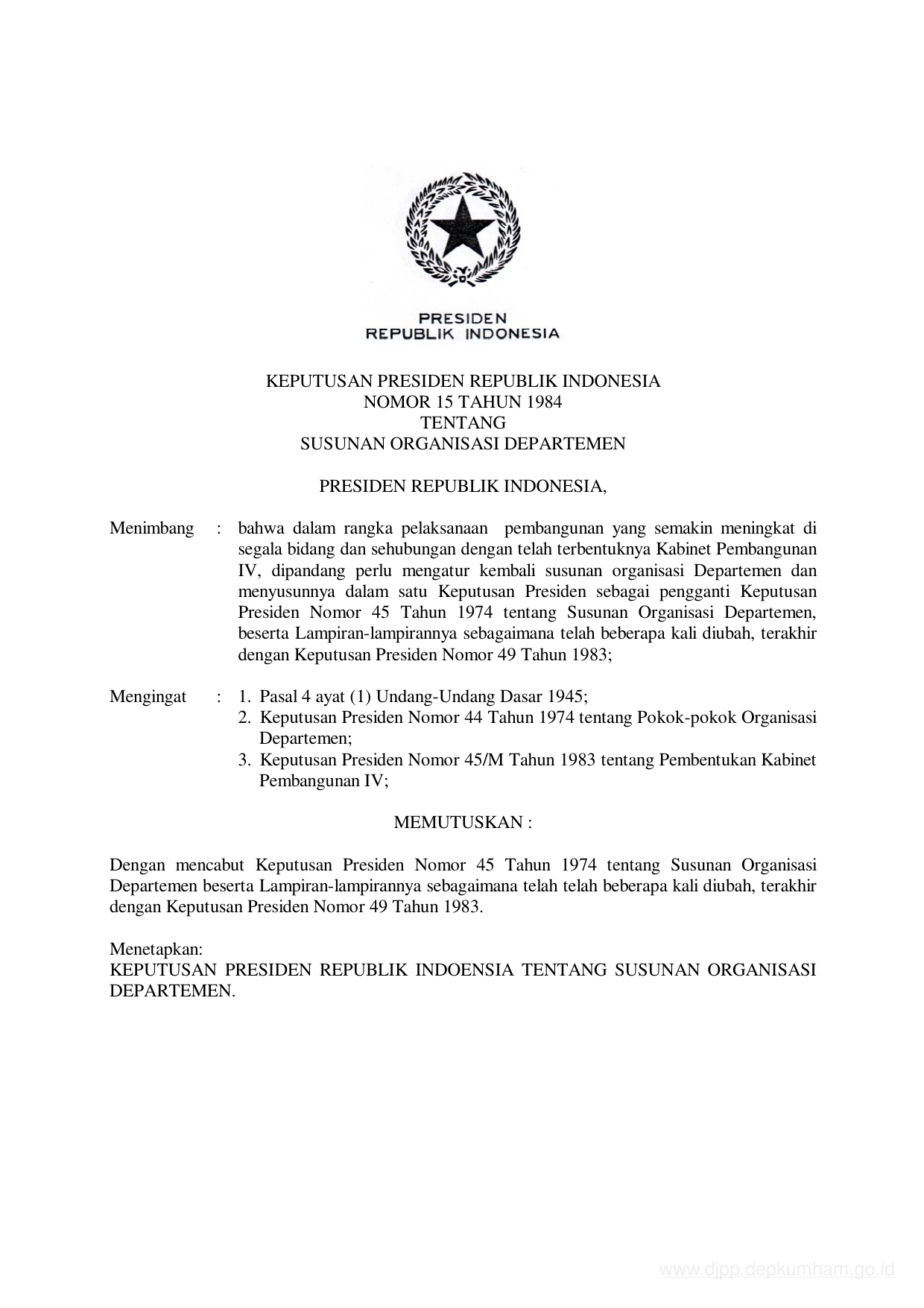 KEPPRES Nomor 15 Tahun 1984 | Keputusan Presiden Nomor 15 Tahun 1984 tentang SUSUNAN ORGANISASI DEPARTEMEN