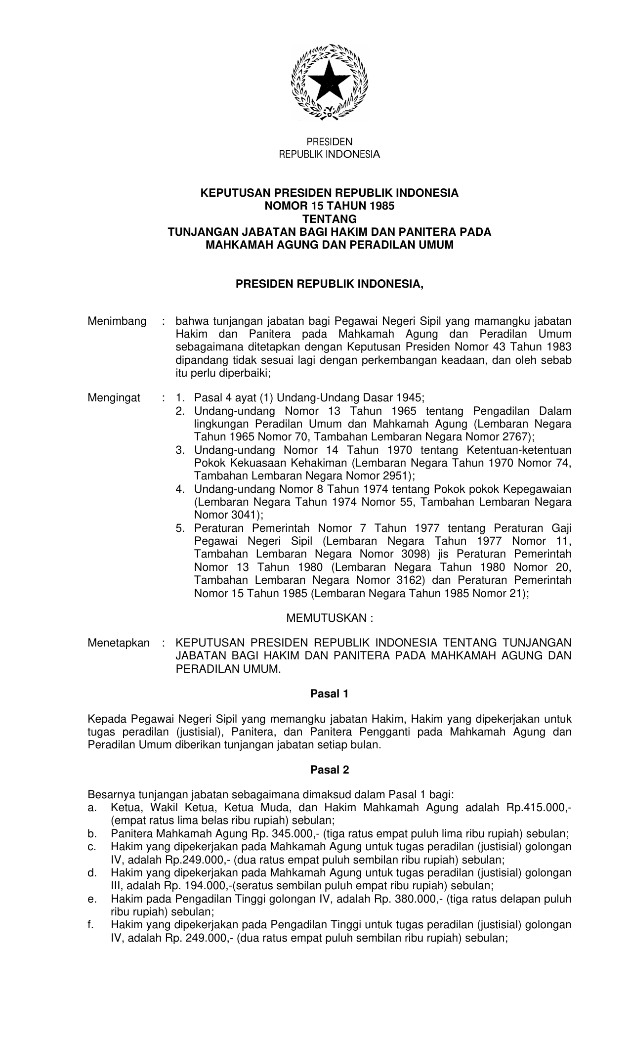 KEPPRES Nomor 15 Tahun 1985 | Keputusan Presiden Nomor 15 Tahun 1985 tentang TUNJANGAN JABATAN BAGI HAKIM DAN PANITERA PADA MAHKAMAH AGUNG DAN PERADILAN UMUM