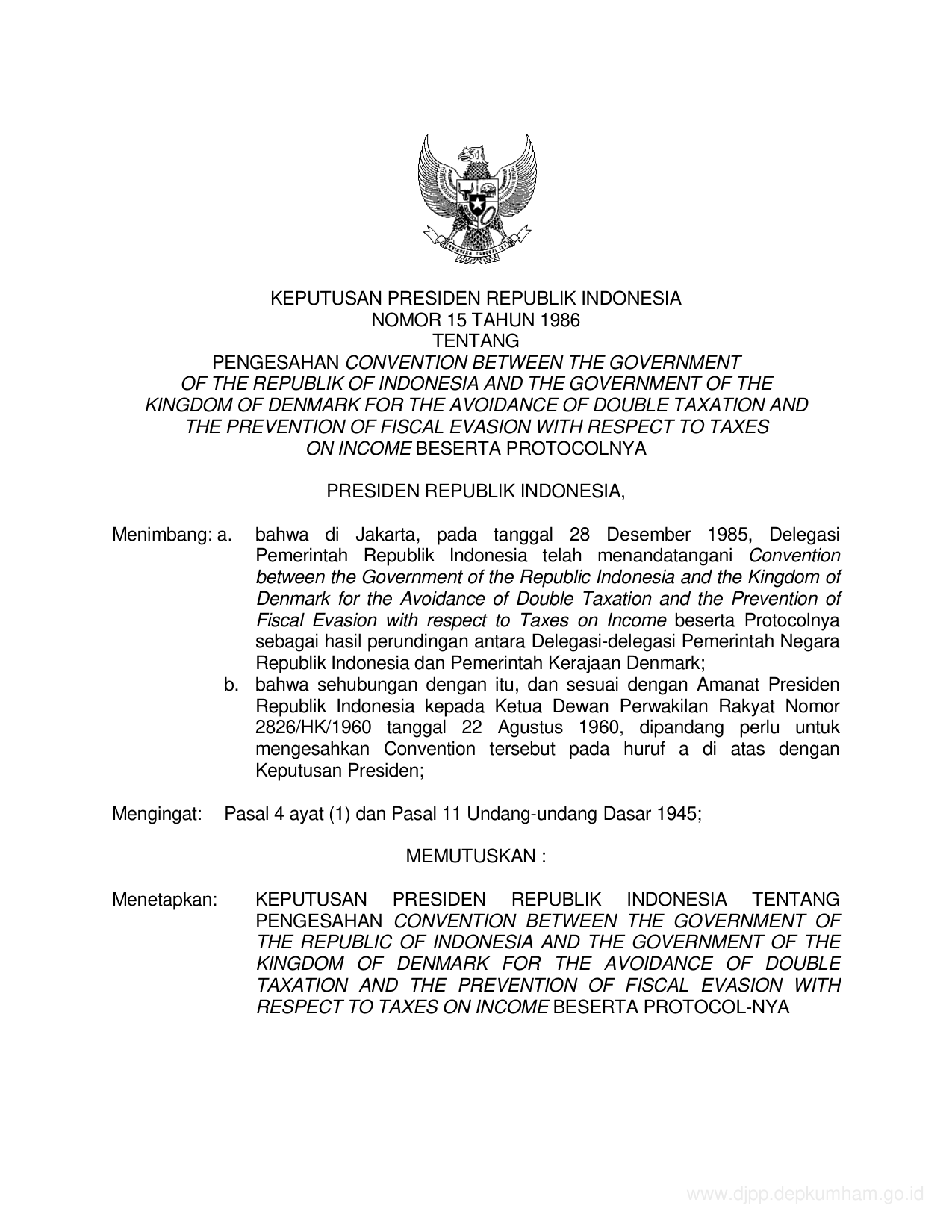 KEPPRES Nomor 15 Tahun 1986 | Keputusan Presiden Nomor 15 Tahun 1986 tentang PENGESAHAN CONVENTION BETWEEN THE GOVERNMENT OF THE REPUBLIC OF INDONESIA AND THE GOVERNMENT OF THE KINGDOM OF DENMARK FOR THE AVOIDANCE OF DOUBLE TEXATION AND THE PREVENTION OF FISKAL EVASION WITH RESPECT TO TAXES ON INCOME BESERTA PROTOCOLNYA