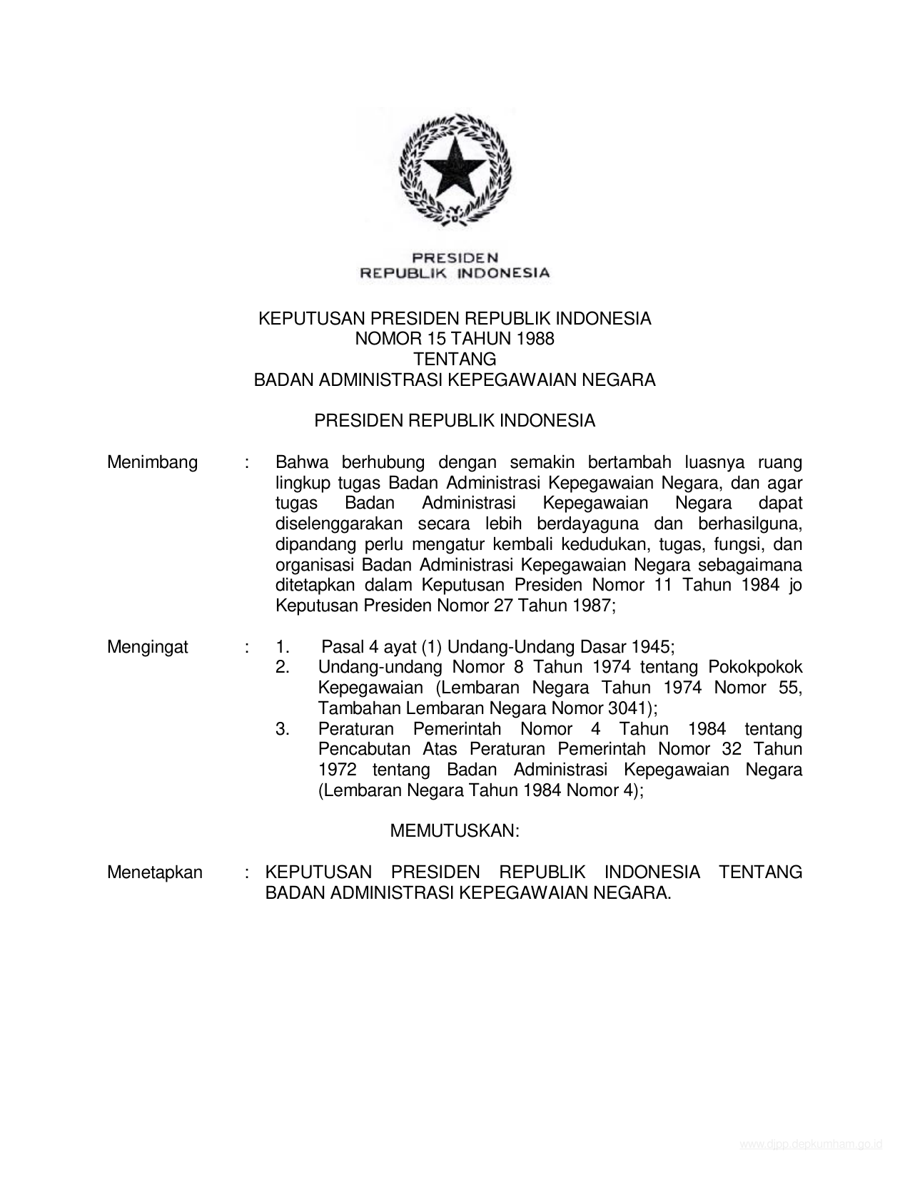 KEPPRES Nomor 15 Tahun 1988 | Keputusan Presiden Nomor 15 Tahun 1988 tentang BADAN ADMINISTRASI KEPEGAWAIAN NEGARA