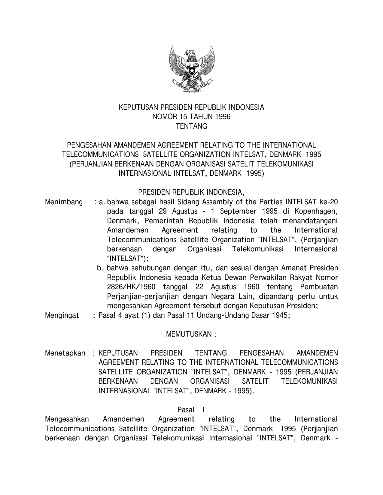 KEPPRES Nomor 15 Tahun 1996 | Keputusan Presiden Nomor 15 Tahun 1996 tentang PENGESAHAN AMANDEMEN AGREEMENT RELATING TO THE INTERNATIONAL TELECOMUNICATION SATELLITE ORGANIZATION "INTELSAT", DENMARK 1995 (PERJANJIAN BERKENAAN DENGAN ORGANISASI SATELIT KOMUNIKASI INTERNASIONAL "INTELSAT", DENMARK 1995)