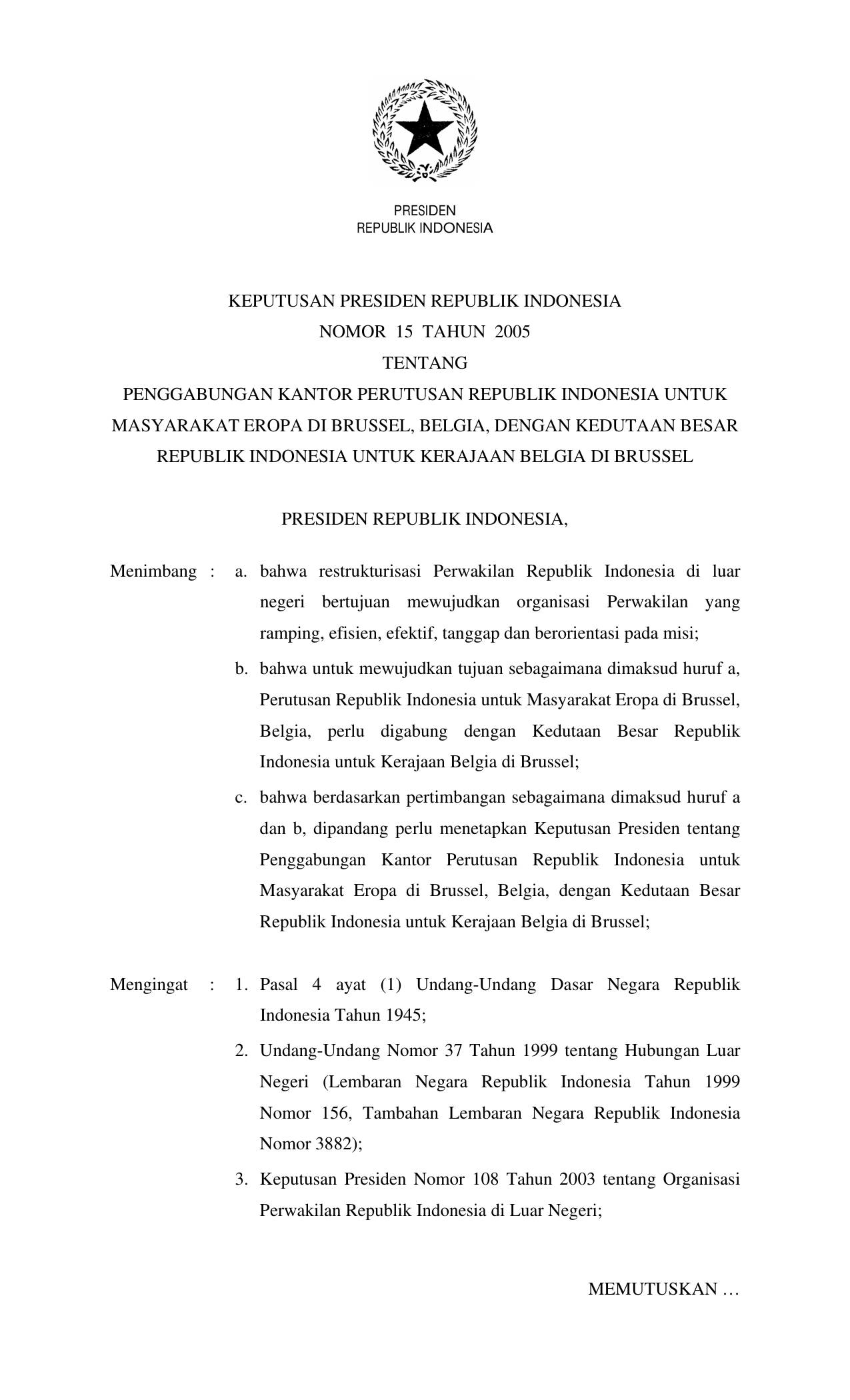 KEPPRES Nomor 15 Tahun 2005 | Keputusan Presiden Nomor 15 Tahun 2005 tentang PENGGABUNGAN KANTOR PERUTUSAN RI UNTUK MASYARAKAT EROPA DI BRUSSEL, BELGIA, DENGAN KEDUTAAN BESAR RI UNTUK KERAJAAN BELGIA DI BRUSSEL