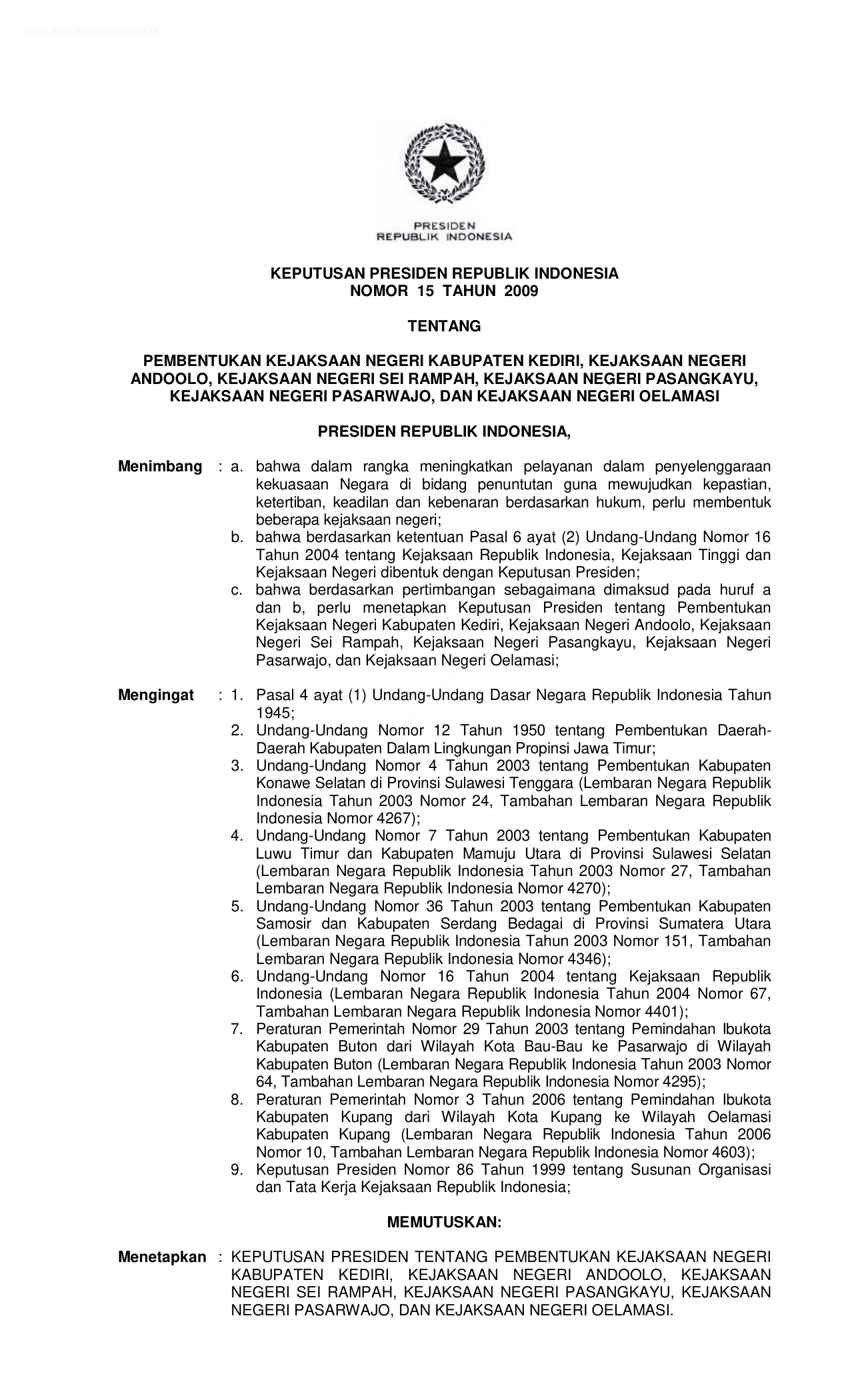KEPPRES Nomor 15 Tahun 2009 | Keputusan Presiden Nomor 15 Tahun 2009 tentang PEMBENTUKAN KEJAKSAAN NEGERI KABUPATEN KEDIRI, KEJAKSAAN NEGERI ANDOOLO, KEJAKSAAN NEGERI SEI RAMPAH, KEJAKSAAN NEGERI PASANGKAYU, KEJAKSAAN NEGERI PASARWAJO, DAN KEJAKSAAN NEGERI OELAMASI