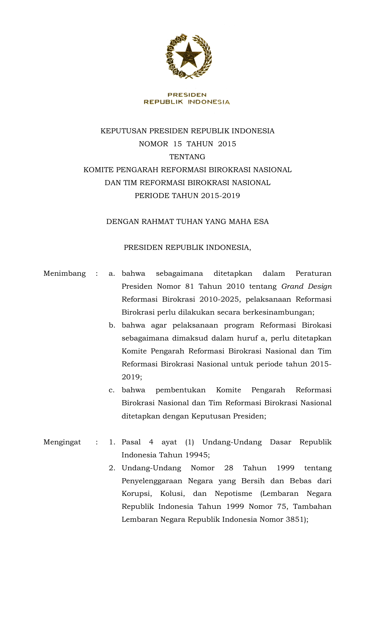 KEPPRES Nomor 15 Tahun 2015 | Keputusan Presiden Nomor 15 Tahun 2015 tentang KOMITE PENGARAH REFORMASI BIROKRASI NASIONAL DAN TIM REFORMASI BIROKRASI NASIONAL PERIODE TAHUN 2015-2019