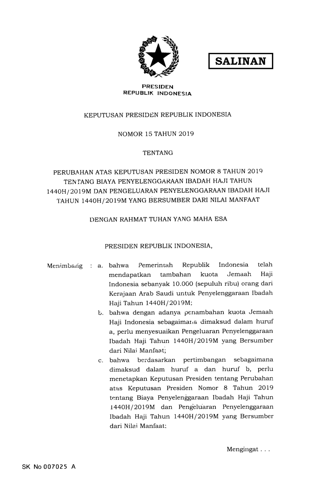 KEPPRES Nomor 15 Tahun 2019 | Keputusan Presiden Nomor 15 Tahun 2019 tentang PERUBAHAN ATAS KEPUTUSAN PRESIDEN NOMOR 8 TAHUN 2019 TENTANG BIAYA PENYELENGGARAAN IBADAH HAJI TAHUN 1440H/2019M DAN PENGELUARAN PENYELENGGARAAN IBADAH HAJI TAHUN 1440H/2019M YANG BERSUMBER DARI NILAI MANFAAT