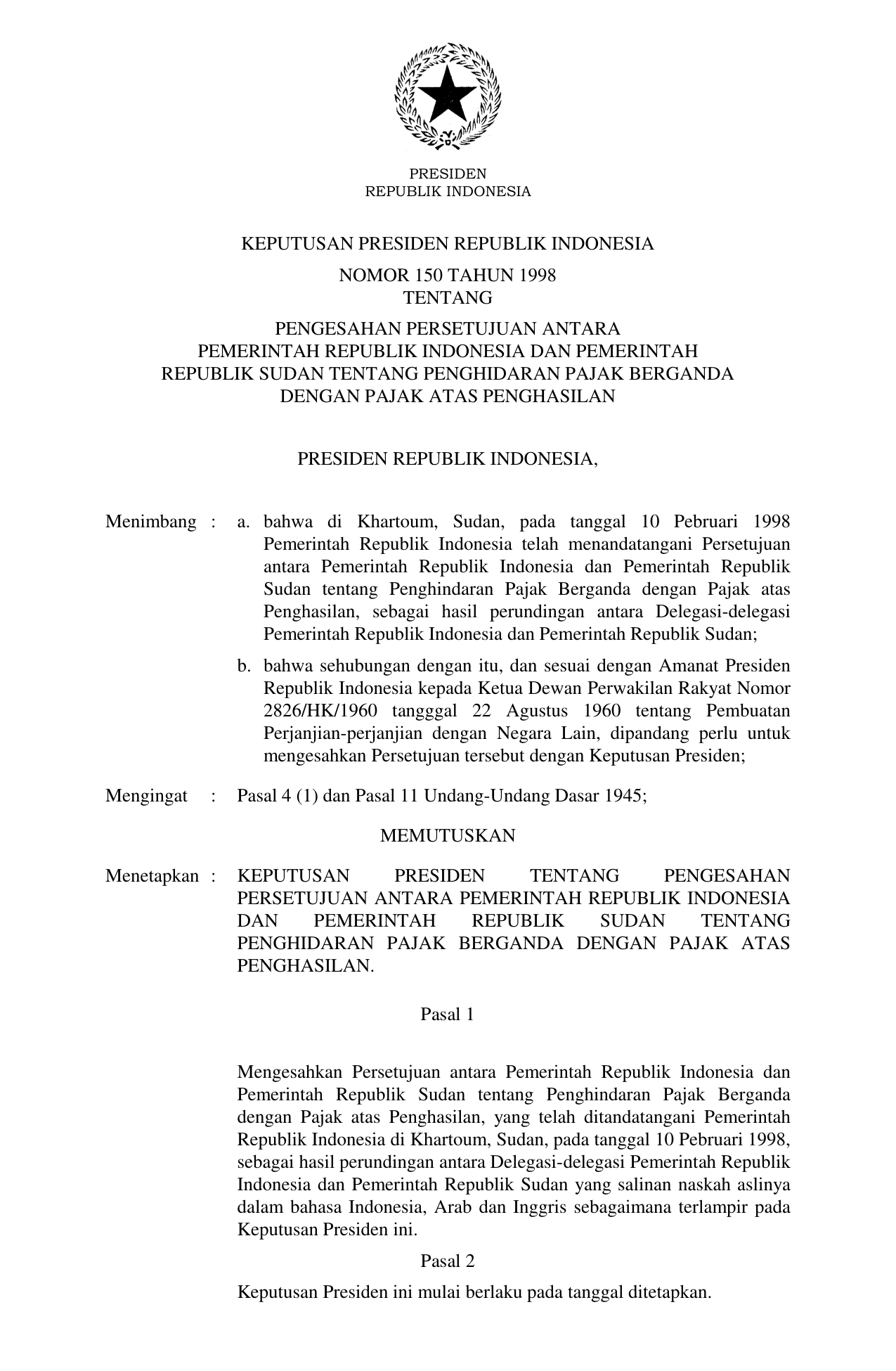 KEPPRES Nomor 150 Tahun 1998 | Keputusan Presiden Nomor 150 Tahun 1998 tentang PENGESAHAN PERSETUJUAN ANTARA PEMERINTAH REPUBLIK INDONESIA DAN PEMERINTAH REPUBLIK SUDAN TENTANG PENGHIDARAN PAJAK BERGANDA DENGAN PAJAK ATAS PENGHASILAN