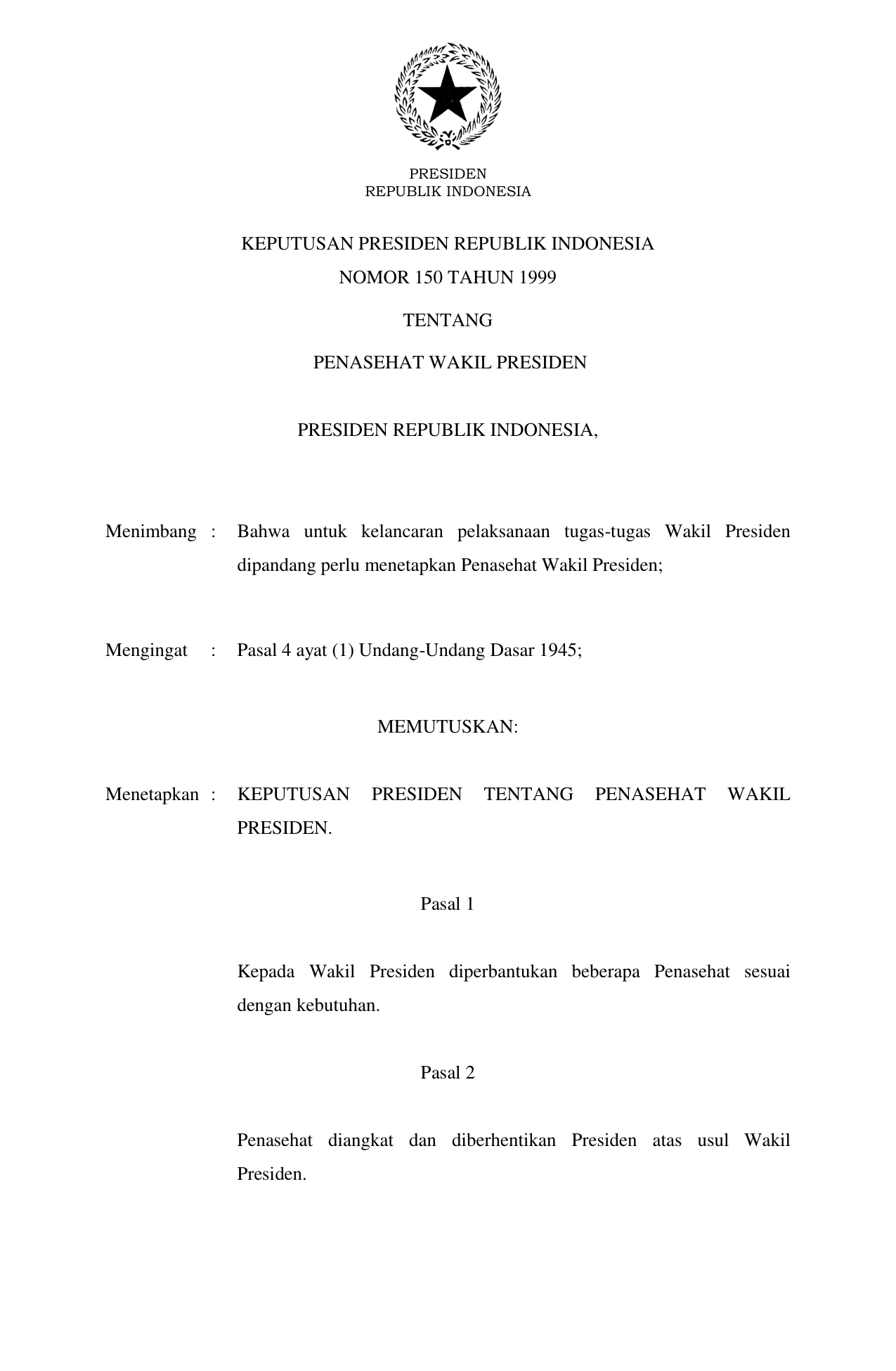 KEPPRES Nomor 150 Tahun 1999 | Keputusan Presiden Nomor 150 Tahun 1999 tentang PENASEHAT WAKIL PRESIDEN
