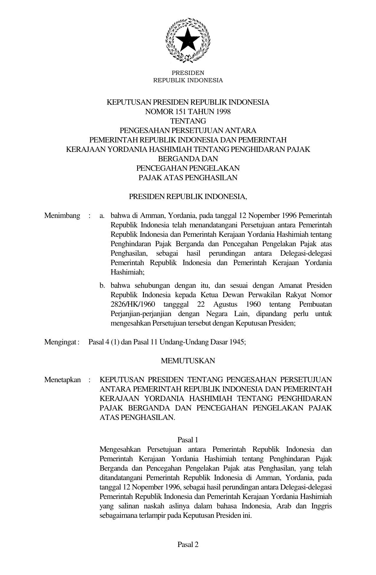 KEPPRES Nomor 151 Tahun 1998 | Keputusan Presiden Nomor 151 Tahun 1998 tentang PENGESAHAN PERSETUJUAN ANTARA PEMERINTAH REPUBLIK INDONESIA DAN PEMERINTAH KERAJAAN YORDANIA HASHIMIAH TENTANG PENGHIDARAN PAJAK BERGANDA