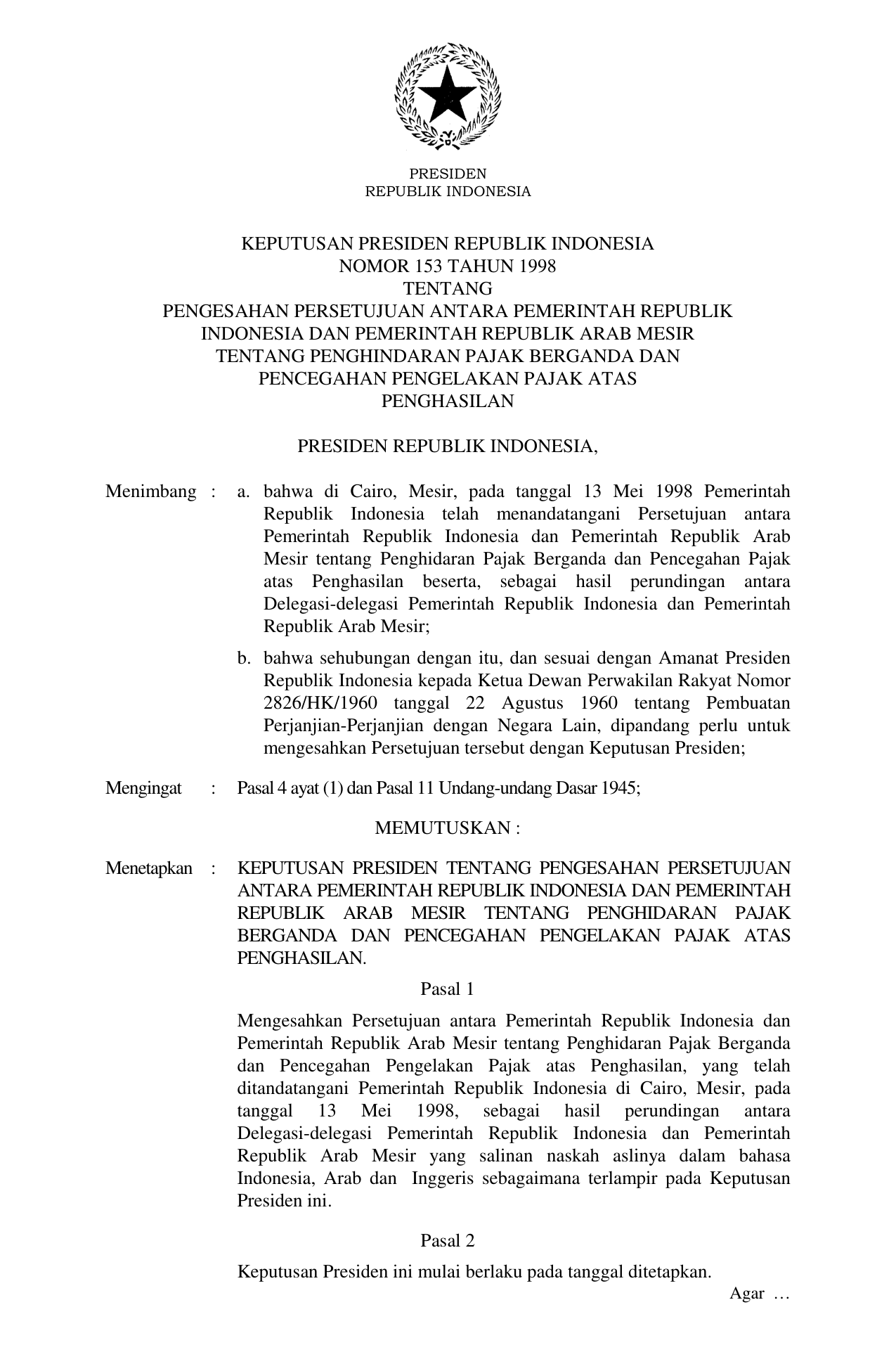 KEPPRES Nomor 153 Tahun 1998 | Keputusan Presiden Nomor 153 Tahun 1998 tentang PENGESAHAN PERSETUJUAN ANTARA PEMERINTAH REPUBLIK INDONESIA DAN PEMERINTAH REPUBLIK ARAB MESIR TENTANG PENGHINDARAN PAJAK BERGANDA DAN PENCEGAHAN PENGELAKAN PAJAK ATAS PENGHASILAN