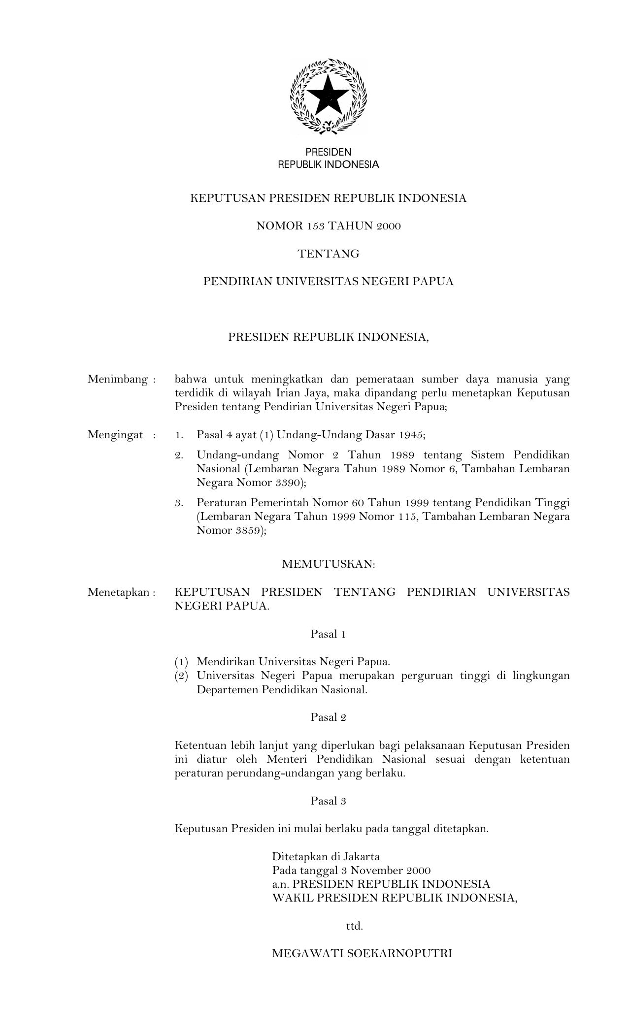 KEPPRES Nomor 153 Tahun 2000 | Keputusan Presiden Nomor 153 Tahun 2000 tentang PENDIRIAN UNIVERSITAS NEGERI PAPUA
