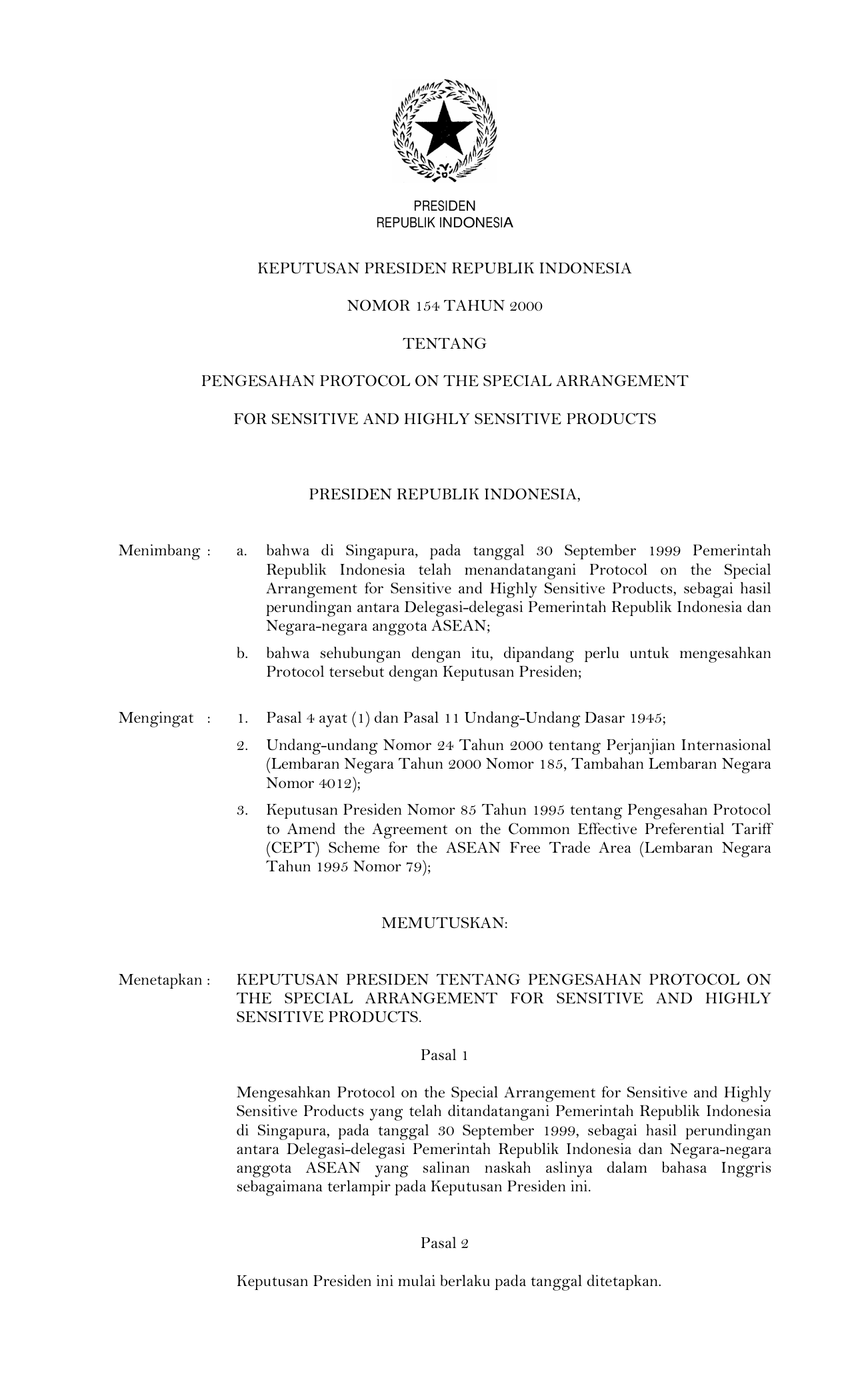 KEPPRES Nomor 154 Tahun 2000 | Keputusan Presiden Nomor 154 Tahun 2000 tentang PENGESAHAN PROTOCOL ON THE SPECIAL ARRANGEMENT FOR SENSITIVE AND HIGHLY SENSITIVE PRODUCTS