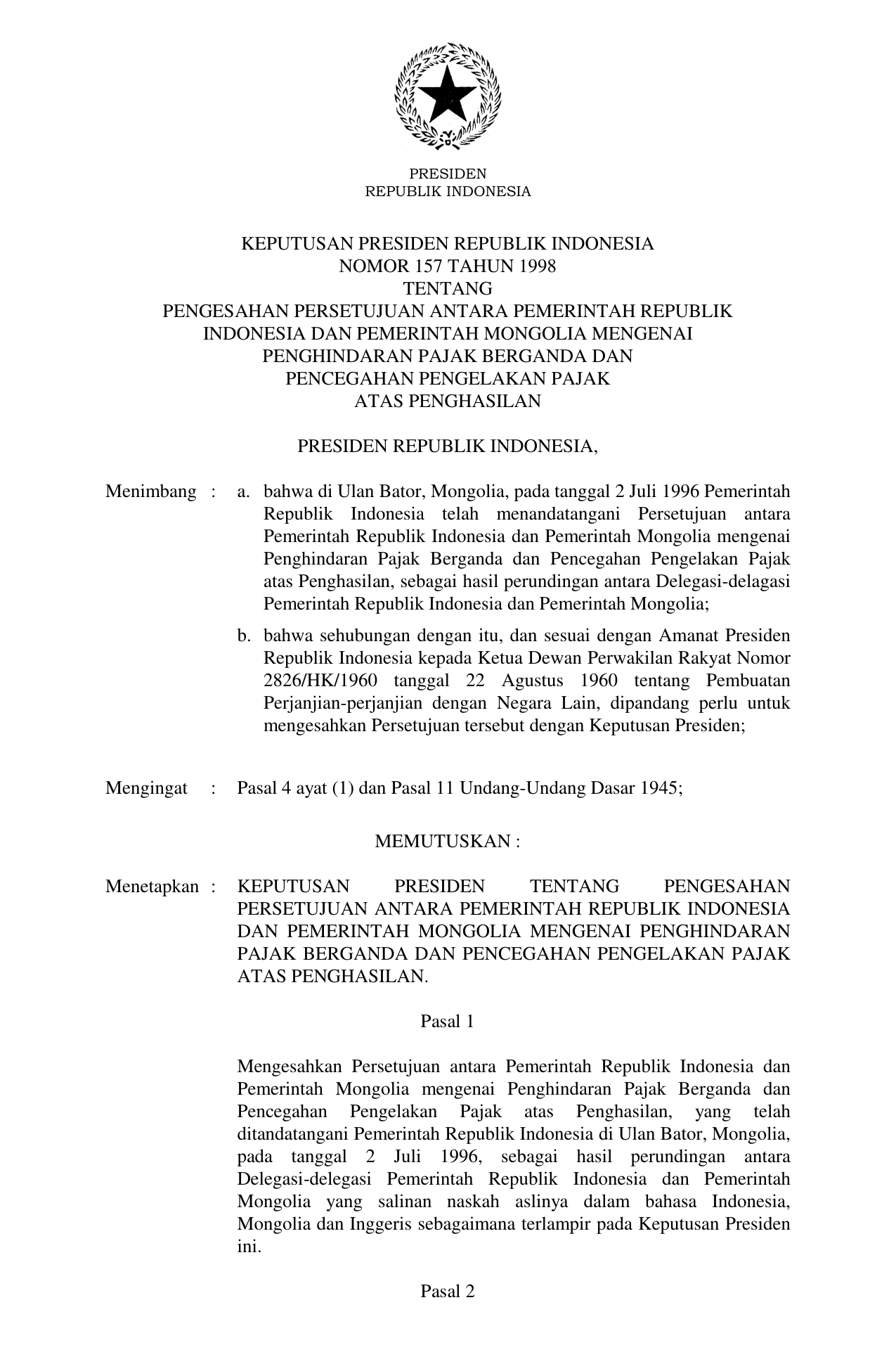 KEPPRES Nomor 157 Tahun 1998 | Keputusan Presiden Nomor 157 Tahun 1998 tentang PENGESAHAN PERSETUJUAN ANTARA PEMERINTAH REPUBLIK INDONESIA DAN PEMERINTAH MONGOLIA MENGENAI PENGHINDARAN PAJAK BERGANDA DAN PENCEGAHAN PENGELAKAN PAJAK ATAS PENGHASILAN