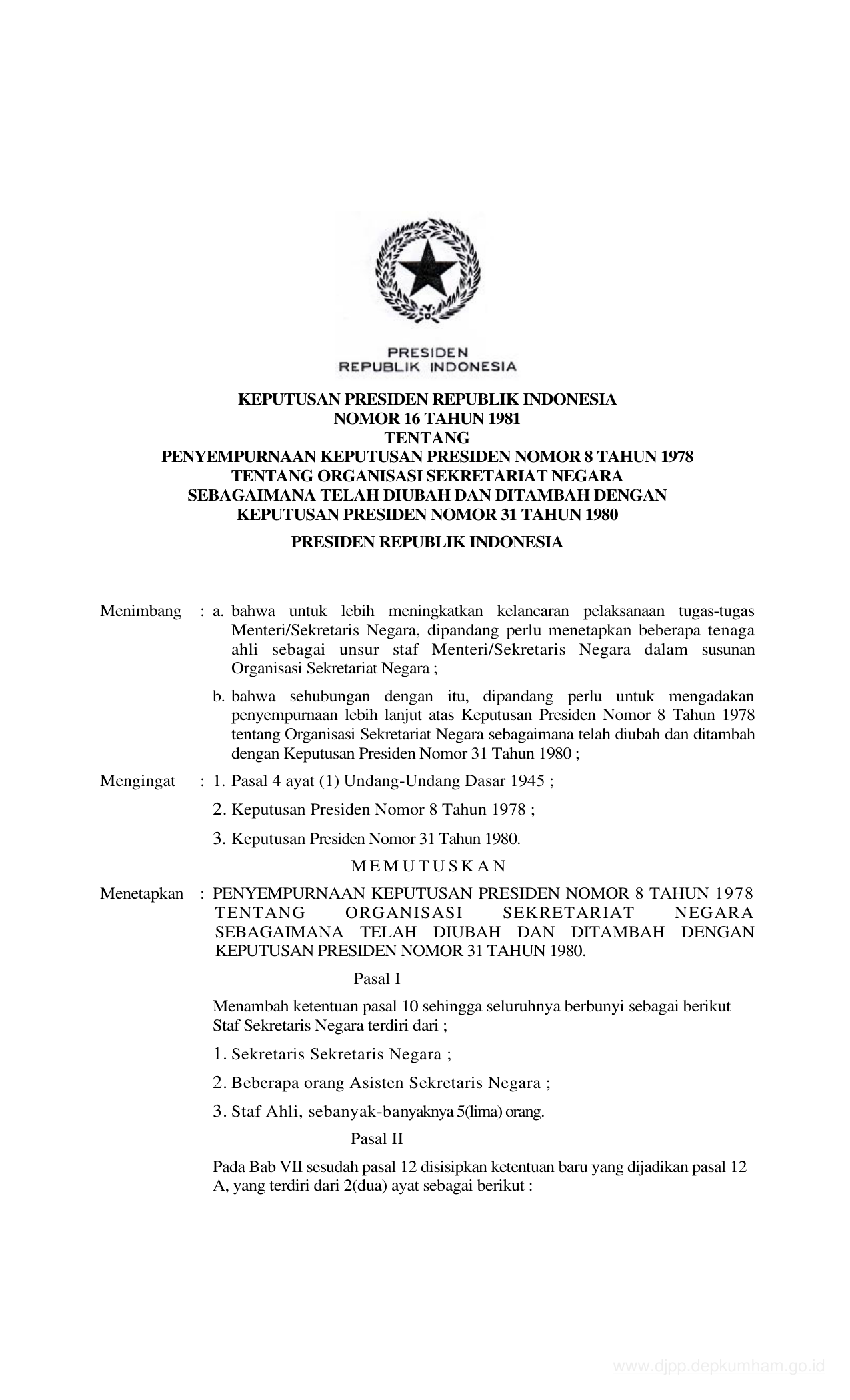 KEPPRES Nomor 16 Tahun 1981 | Keputusan Presiden Nomor 16 Tahun 1981 tentang PENYEMPURNAAN KEPUTUSAN PRESIDEN NOMOR 8 TAHUN 1978 TENTANG ORGANISASI SEKRETARIAT NEGARA SEBAGAIMANA TELAH DIUBAH DAN DITAMBAH DENGAN KEPUTUSAN PRESIDEN NOMOR 31 TAHUN 1980