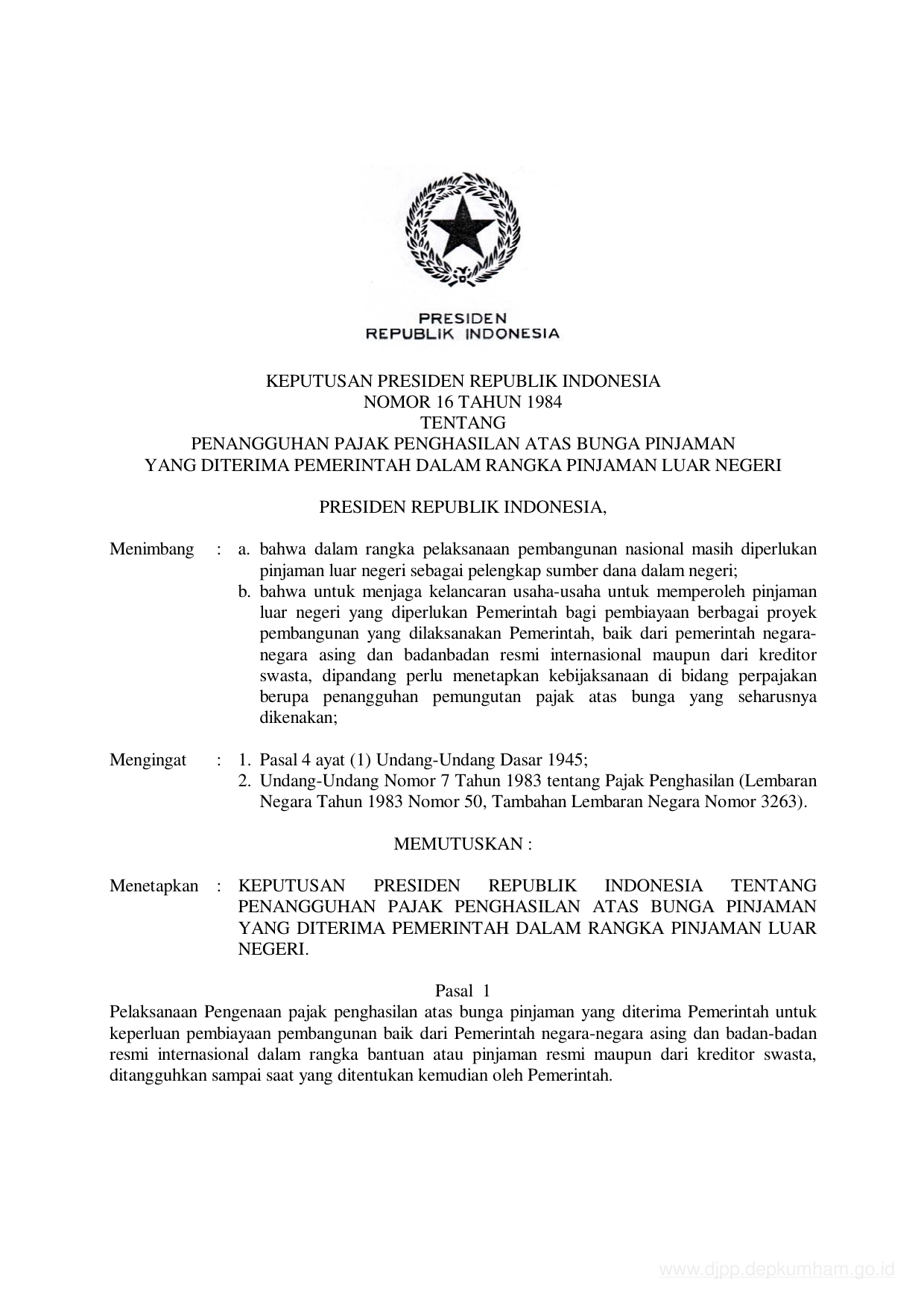 KEPPRES Nomor 16 Tahun 1984 | Keputusan Presiden Nomor 16 Tahun 1984 tentang PENANGGUHAN PAJAK PENGHASILAN ATAS BUNGA PINJAMAN YANG DITERIMA PEMERINTAH DALAM RANGKA PINJAMAN LUAR NEGERI