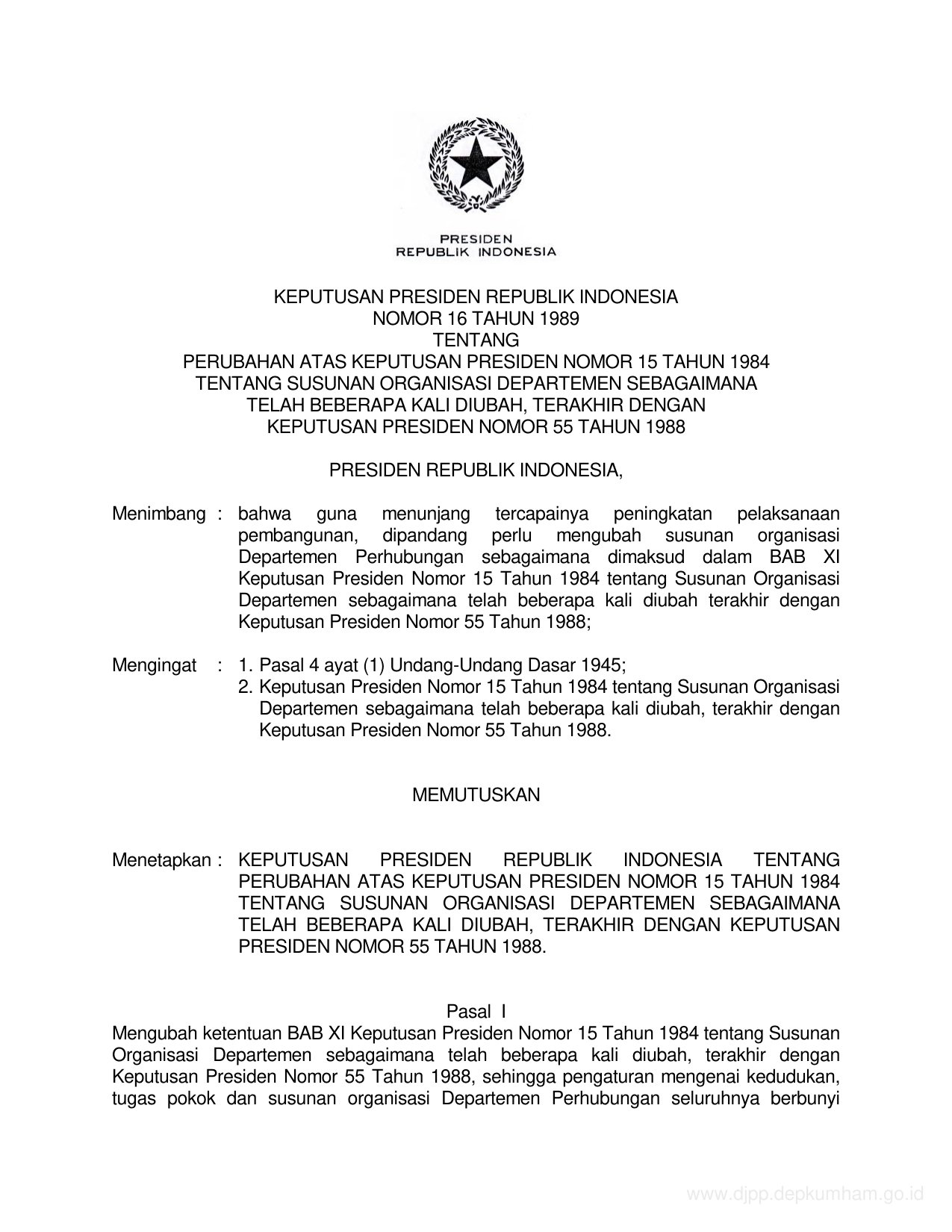 KEPPRES Nomor 16 Tahun 1989 | Keputusan Presiden Nomor 16 Tahun 1989 tentang PERUBAHAN ATAS KEPUTUSAN PRESIDEN NOMOR15 TAHUN 1984 TENTANG SUSUNAN ORGANISASI DEPARTEMEN SEBAGAIMANA TELAH BEBERAPA KALI DIUBAH TERAKHIR DENGAN KEPUTUSAN NOMOR 55 TAHUN 1988