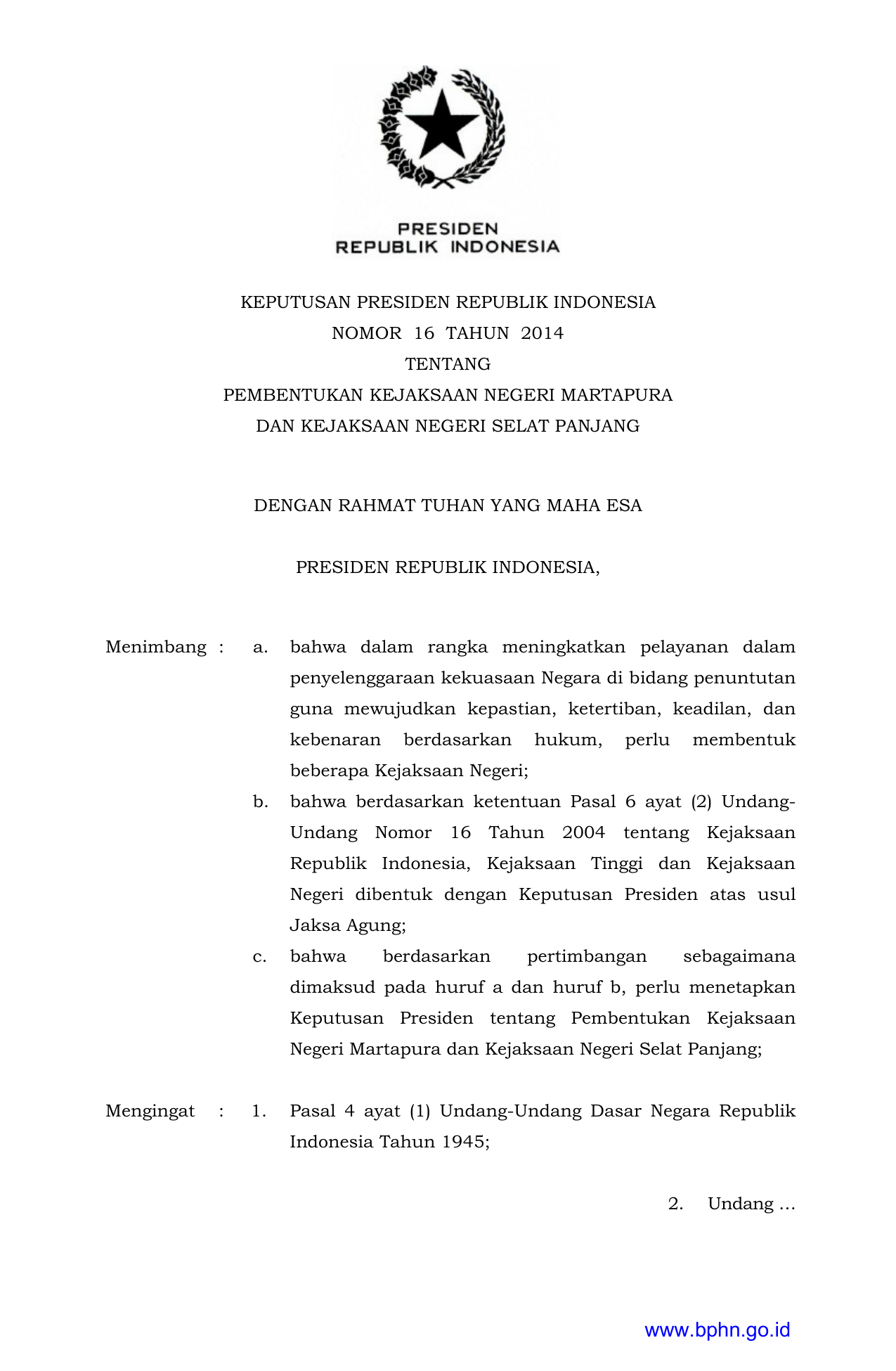 KEPPRES Nomor 16 Tahun 2014 | Keputusan Presiden Nomor 16 Tahun 2014 tentang PEMBENTUKAN KEJAKSAAN NEGERI MARTAPURA DAN KEJAKSAAN NEGERI SELAT PANJANG