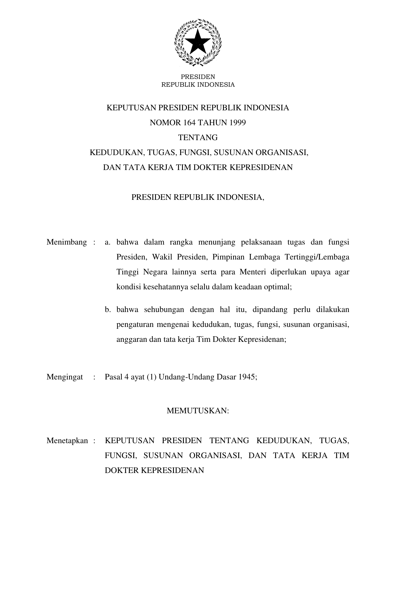 KEPPRES Nomor 164 Tahun 1999 | Keputusan Presiden Nomor 164 Tahun 1999 tentang KEDUDUKAN, TUGAS, GUNGSI, SUSUNAN ORGANISASI DAN TATA KERJA TIM DOKTER KEPPRESIDENAN