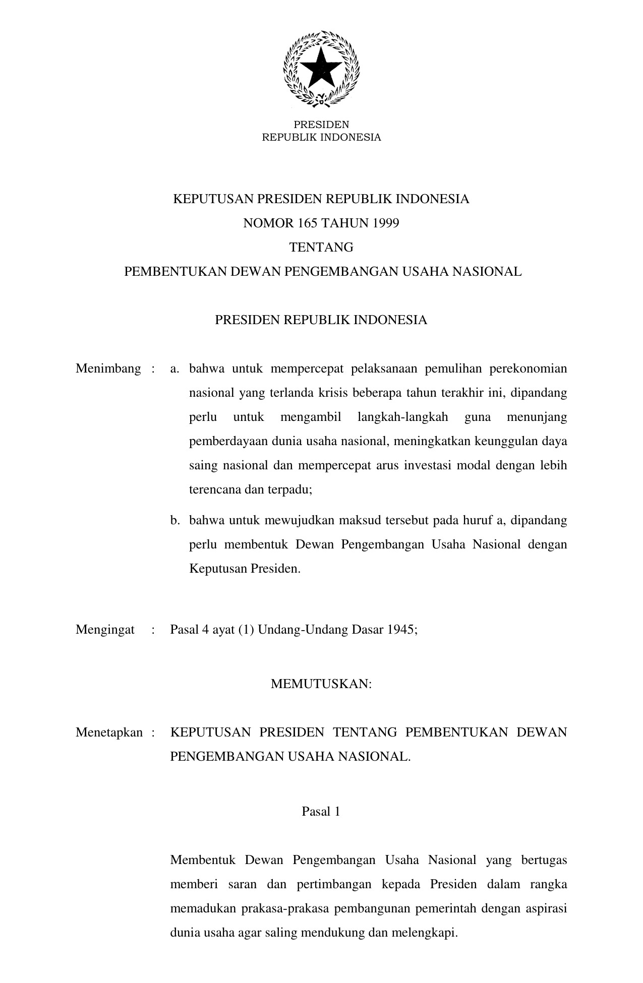 KEPPRES Nomor 165 Tahun 1999 | Keputusan Presiden Nomor 165 Tahun 1999 tentang PEMBENTUKAN DEWAN PENGEMBANGAN USAHA NASIONAL