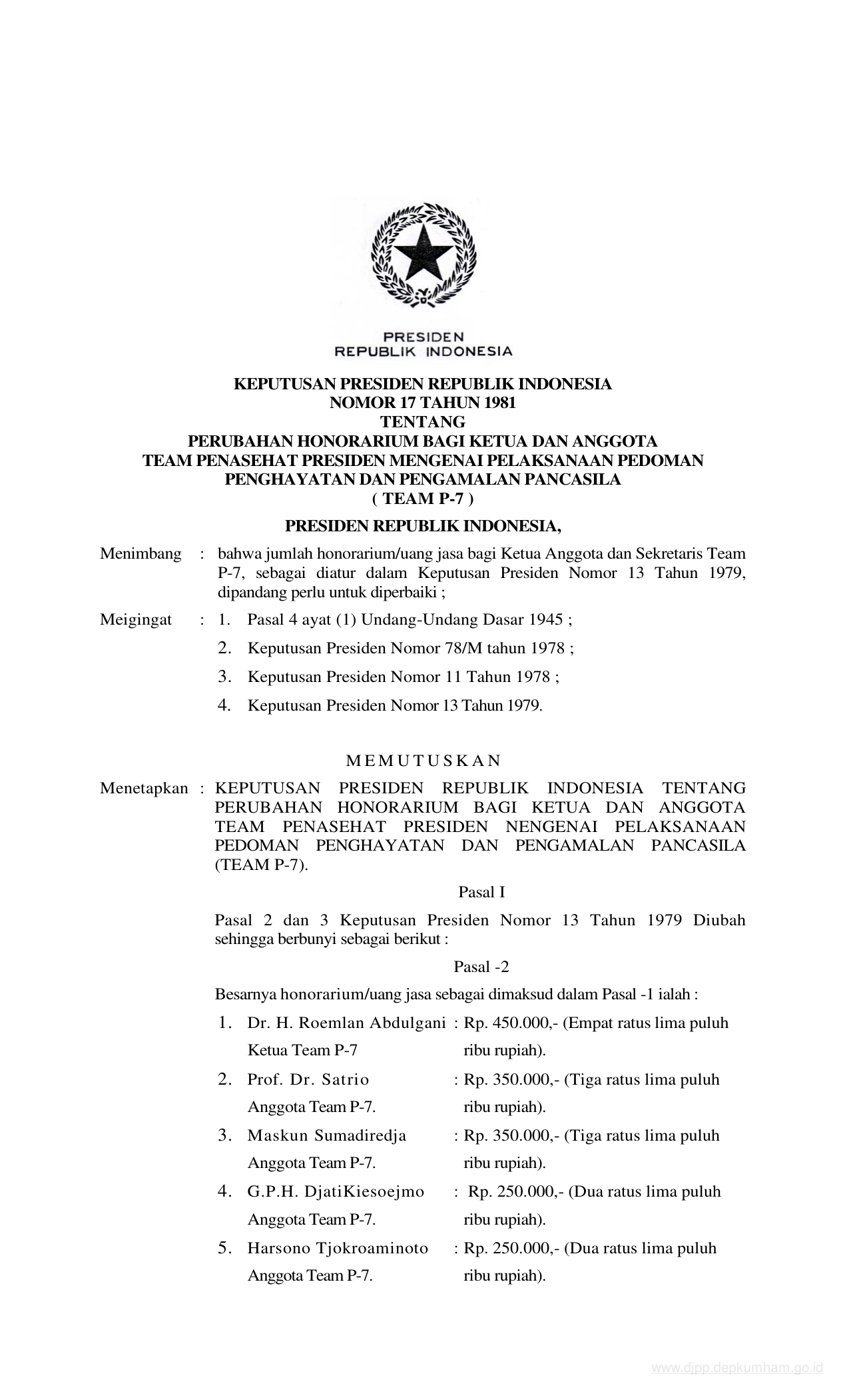 KEPPRES Nomor 17 Tahun 1981 | Keputusan Presiden Nomor 17 Tahun 1981 tentang PERUBAHAN HONORARIUM BAGI KETUA DAN ANGGOTA TEAM PENASEHAT PRESIDEN MENGENAI PELAKSANAAN PEDOMAN DAN PENGHAYATAN DAN PENGAMALAN PANCASILA (TEAM P-7)