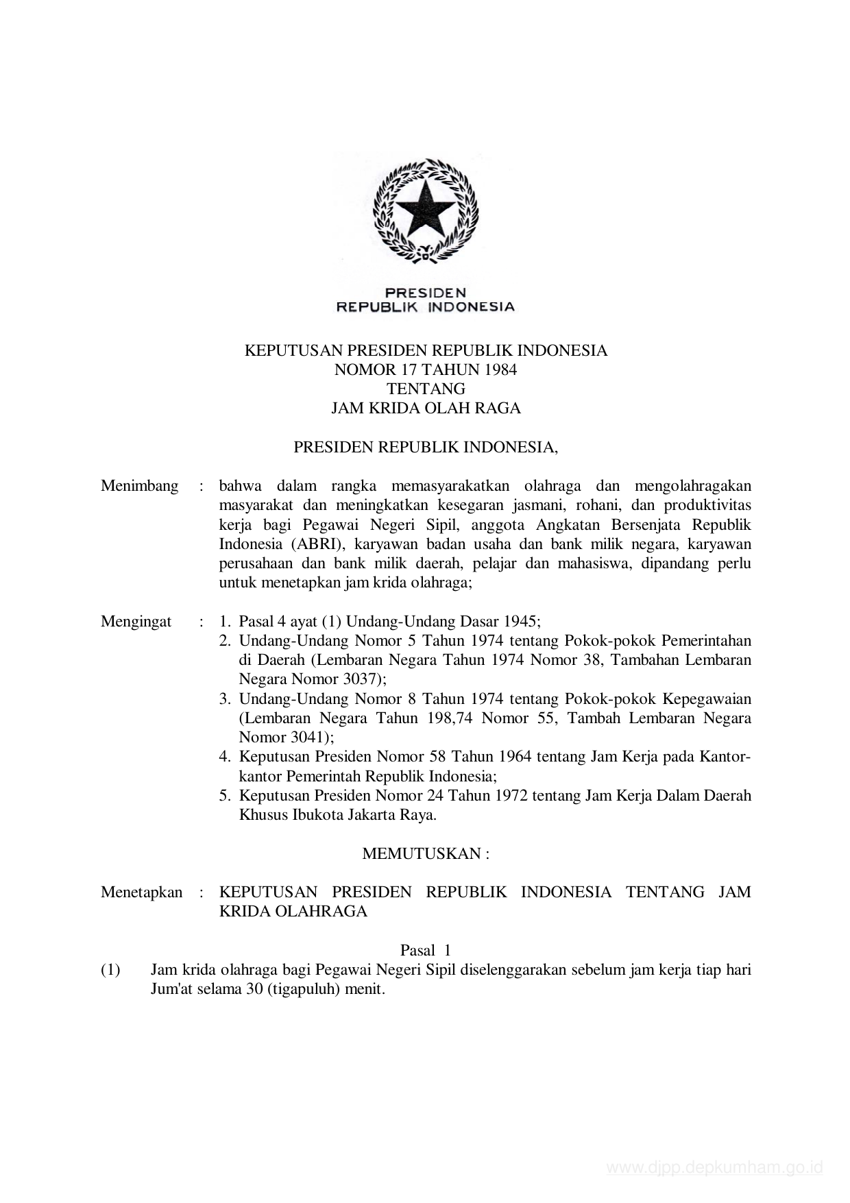 KEPPRES Nomor 17 Tahun 1984 | Keputusan Presiden Nomor 17 Tahun 1984 tentang JAM KRIDA OLAHRAGA