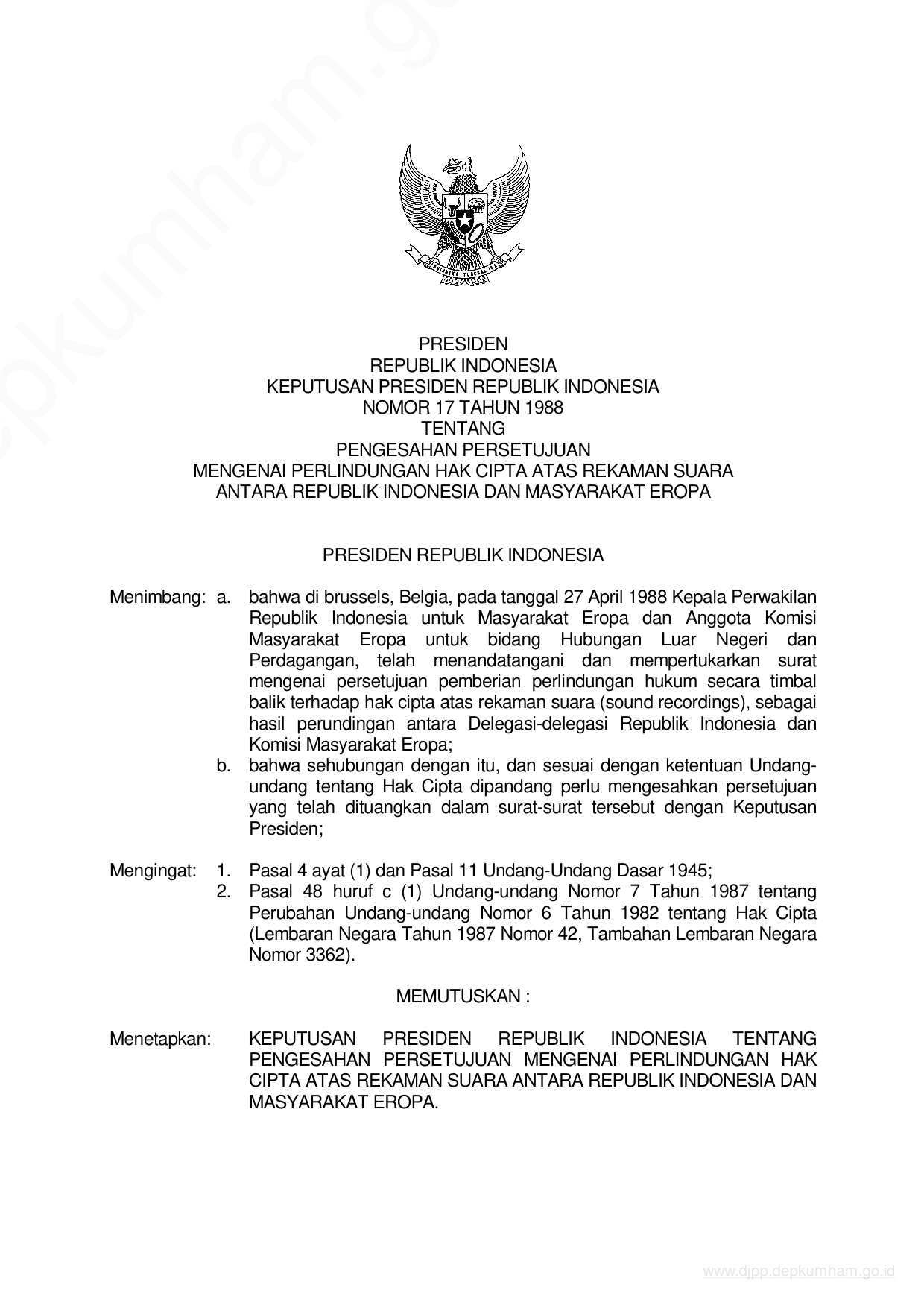 KEPPRES Nomor 17 Tahun 1988 | Keputusan Presiden Nomor 17 Tahun 1988 tentang PENGESAHAN PERSETUJUAN MENGENAI PERLINDUNGAN HAK CIPTA ATAS REKAMAN SUARA ANTARA RI DAN MASYARAKAT EROPA