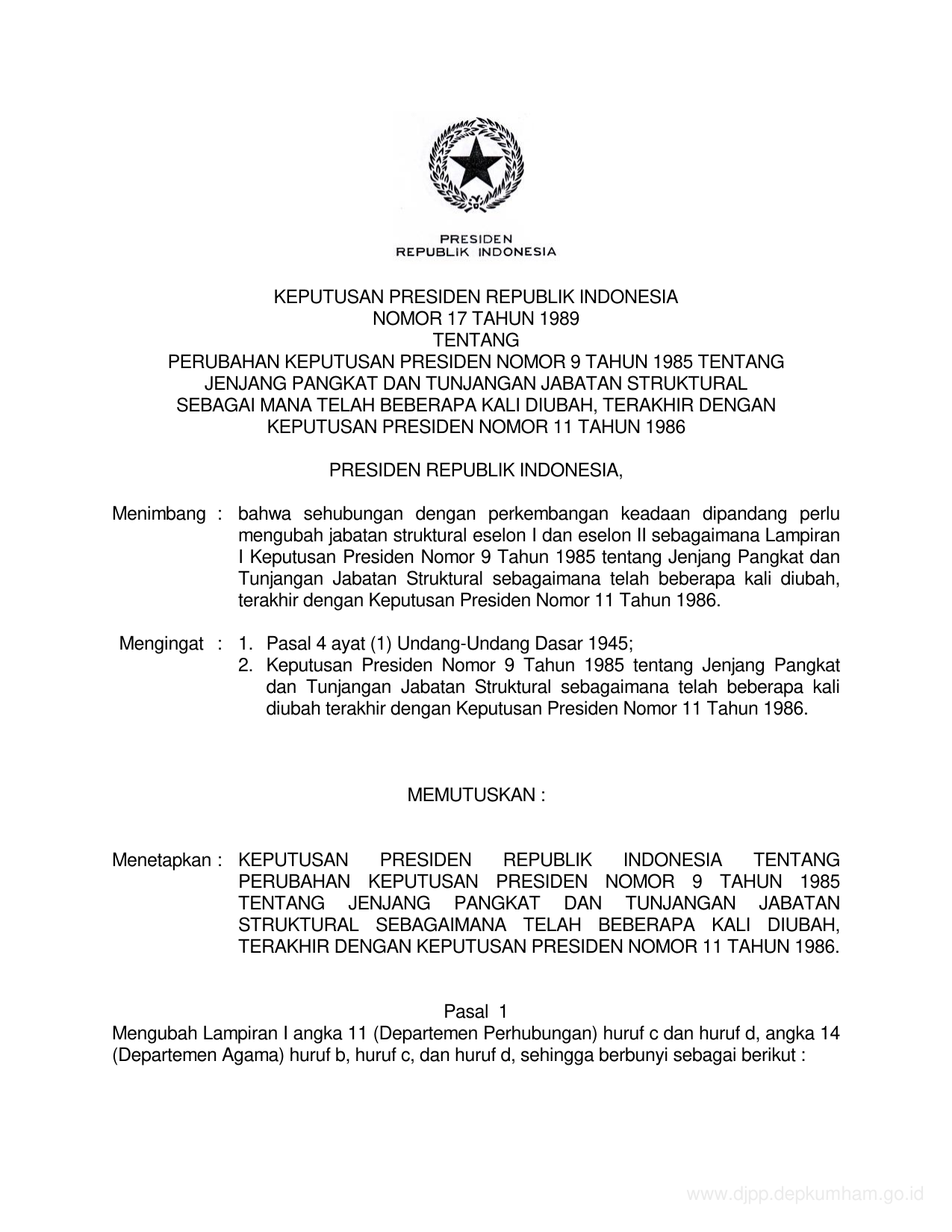 KEPPRES Nomor 17 Tahun 1989 | Keputusan Presiden Nomor 17 Tahun 1989 tentang PERUBAHAN KEPUTUSAN PRESIDEN NOMOR 9 TAHUN 1985 TENTANG JENJANG PANGKAT DAN TUNJANGAN JABATAN STRUKTURAL SEBAGAIMANA TELAH BEBERAPA KALI DIUBAH TERAKHIR DENGAN KEPUTUSAN PRESIDEN NOMOR 11 TAHUN 1986