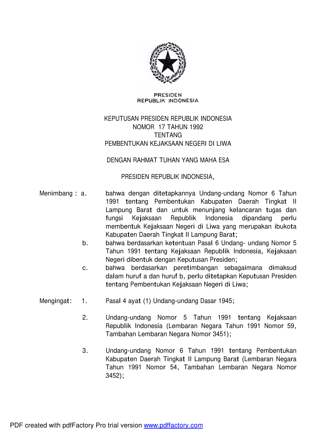 KEPPRES Nomor 17 Tahun 1992 | Keputusan Presiden Nomor 17 Tahun 1992 tentang PEMBENTUKAN KEJAKSAAN NEGERI DI LIWA