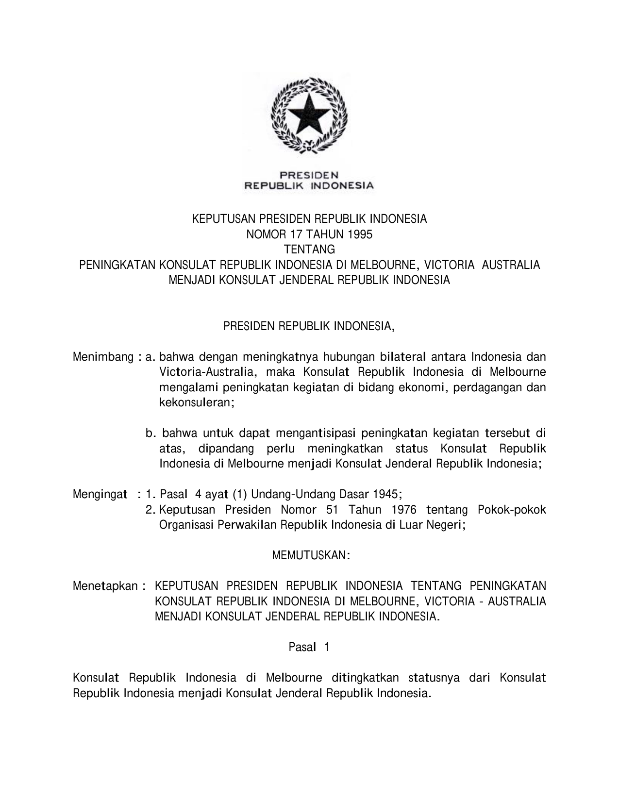KEPPRES Nomor 17 Tahun 1995 | Keputusan Presiden Nomor 17 Tahun 1995 tentang PENINGKATAN KONSULAT RI DI MELBOURNE, VICTORIA, AUSTRALIA MENJADI KONSULAT JENDERAL RI