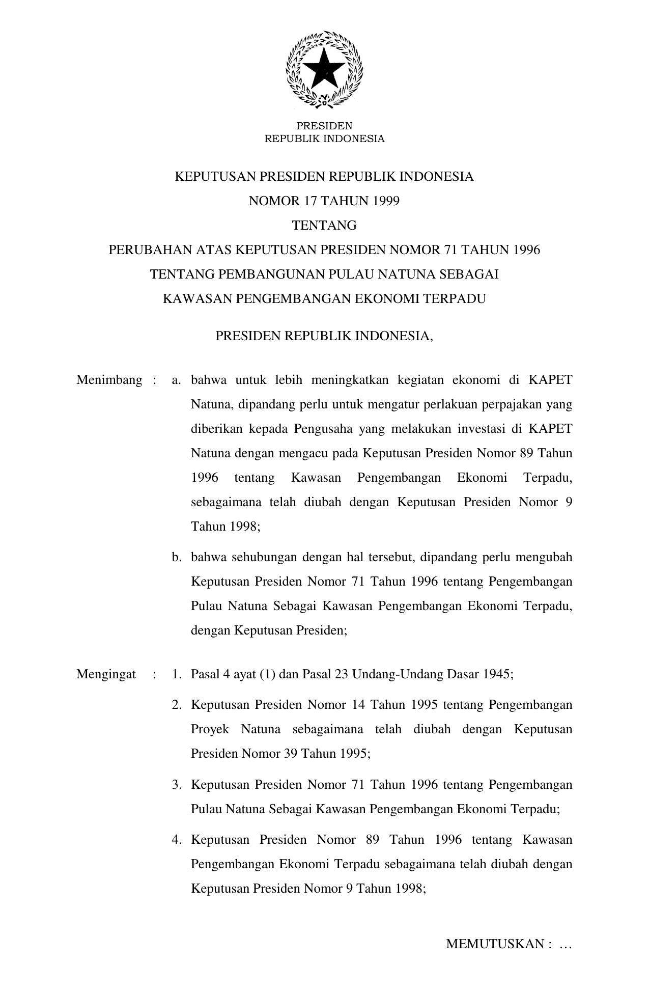 KEPPRES Nomor 17 Tahun 1999 | Keputusan Presiden Nomor 17 Tahun 1999 tentang PERUBAHAN KEPPRES 71-1996 TENTANG PEMBANGUNAN PULAU NATUNA SEBAGAI KAWASAN PENGEMBANGAN EKONOMI TERPADU