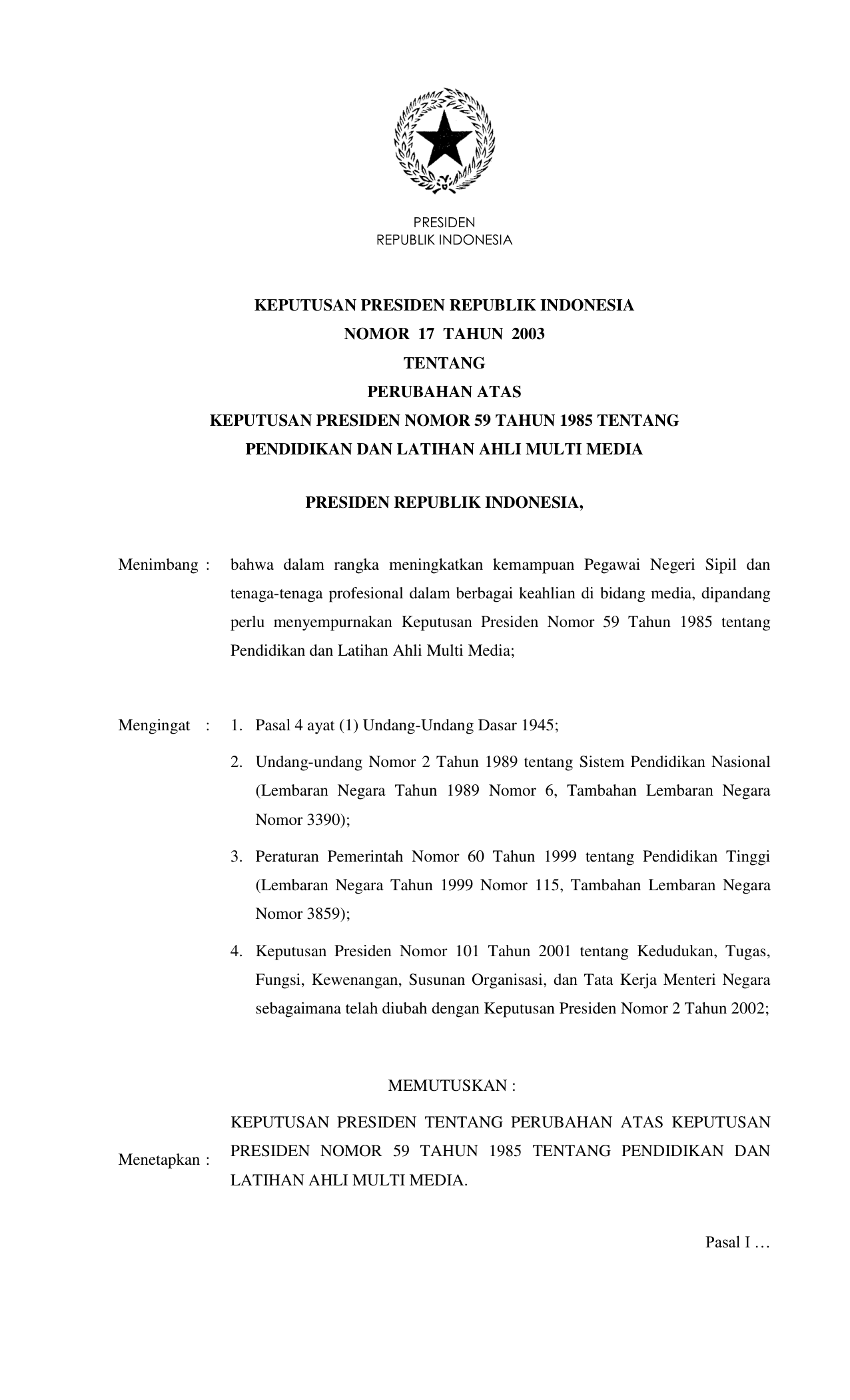 KEPPRES Nomor 17 Tahun 2003 | Keputusan Presiden Nomor 17 Tahun 2003 tentang PENDIDIKAN DAN LATIHAN AHLI MULTI MEDIA