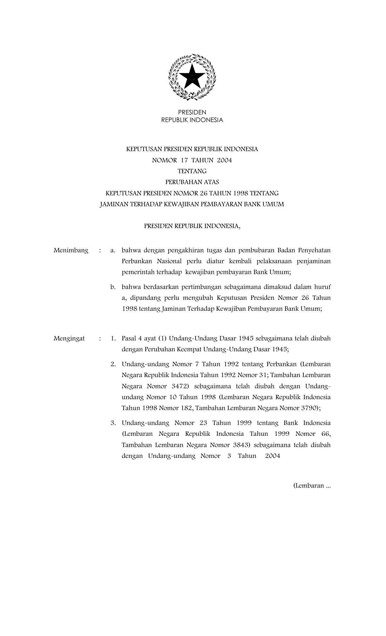 KEPPRES Nomor 17 Tahun 2004 | Keputusan Presiden Nomor 17 Tahun 2004 tentang PERUBAHAN KEPPRES 26-1988 TENTANG JAMINAN TERHADAP KEWAJIBAN PEMBAYARAN BANK UMUM