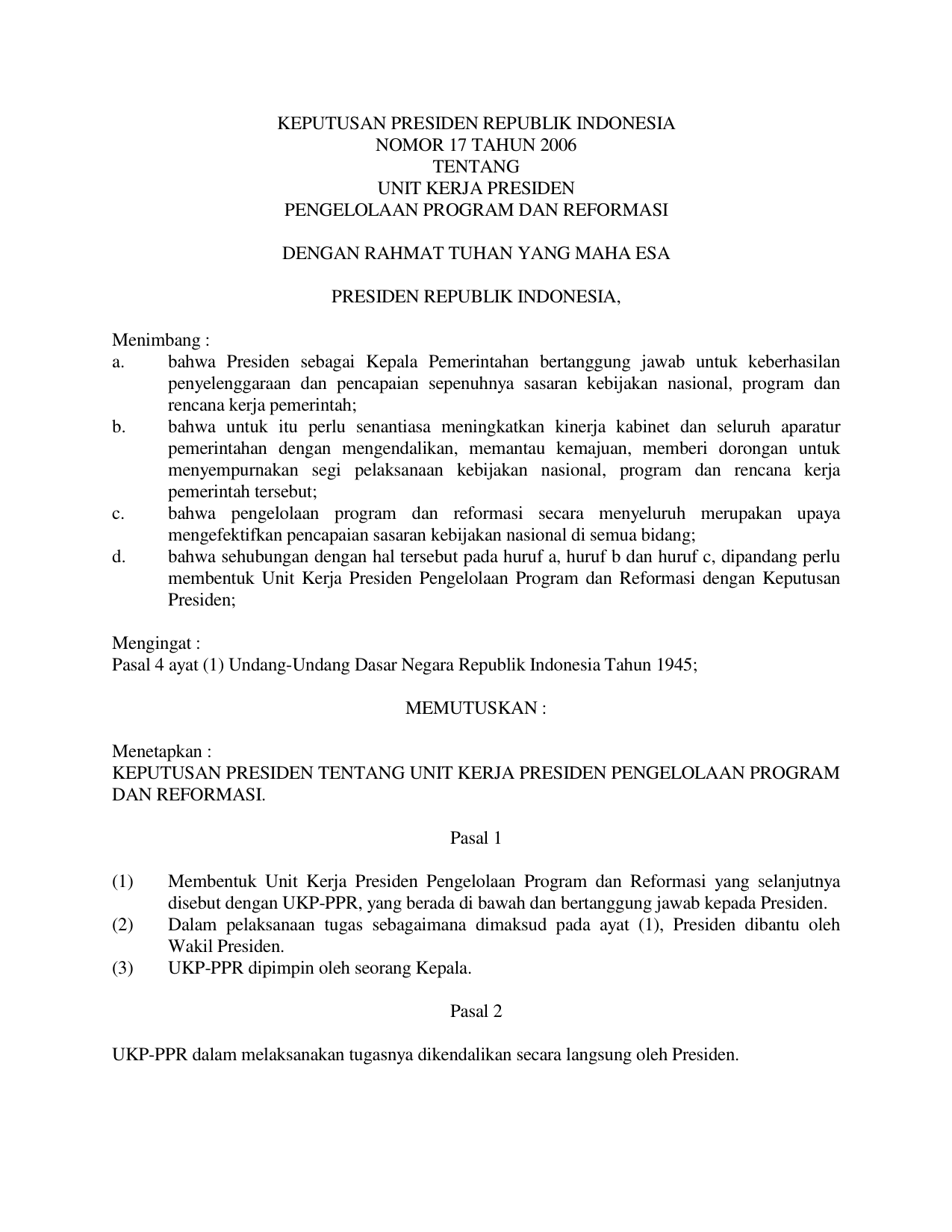 KEPPRES Nomor 17 Tahun 2006 | Keputusan Presiden Nomor 17 Tahun 2006 tentang UNIT KERJA PRESIDEN PENGELOLAAN PROGRAM DAN REFORMASI