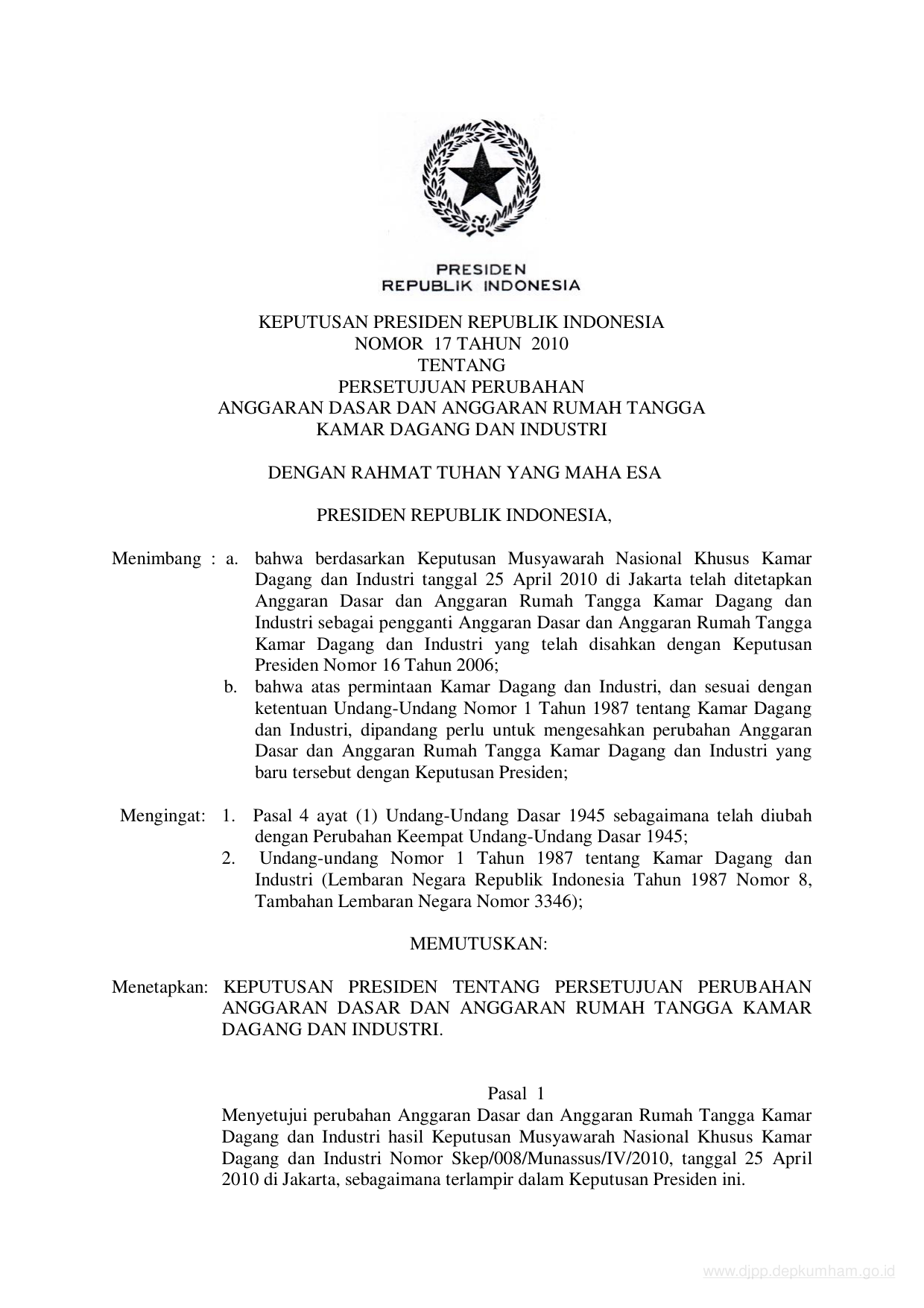 KEPPRES Nomor 17 Tahun 2010 | Keputusan Presiden Nomor 17 Tahun 2010 tentang PERSETUJUAN PERUBAHAN ANGGARAN DASAR DAN ANGGARAN RUMAH TANGGA KAMAR DAGANG DAN INDUSTRI
