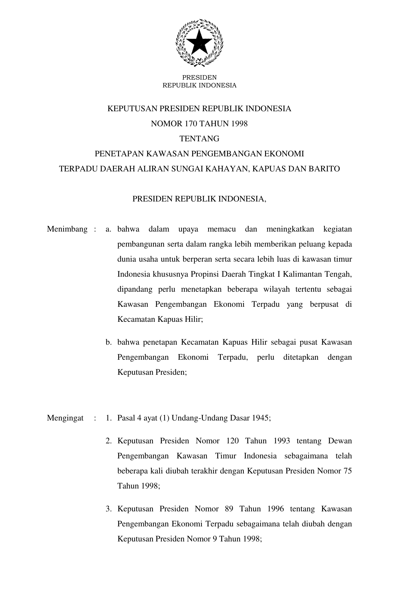 KEPPRES Nomor 170 Tahun 1998 | Keputusan Presiden Nomor 170 Tahun 1998 tentang PENETAPAN KAWASAN PENGEMBANGAN EKONOMI TERPADU DAERAH ALIRAN SUNGAI KAHAYAN, KAPUAS DAN BARITO